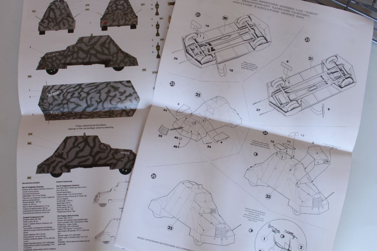 Na słowa uznania zasługuje natomiast instrukcja. Podzielona jest na dwie części. W pierwszej znajdziemy bardzo obszerny opis historii Kubusia, konstrukcje, udział w powstańczych walkach i dalsze dzieje, oraz kolorowy schemat malowania. Tabelę kolorów opracowano na podstawie palety Vallejo. Dysponujemy również, na co należy zwrócić uwagę, schematem rozmieszczenia przestrzelin, jakie pojawiły się na pancerzu Kubusia w wyniku działań wojennych. Cos dla lubiących ślady eksploatacji. Druga część instrukcji, już czarno – biała to schematy montażu. Opracowane czytelnie, dzięki czemu poszczególne etapy budowy nie powinny sprawić problemu.