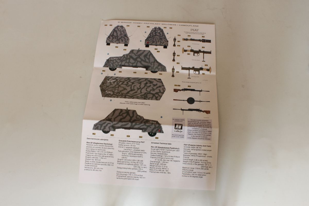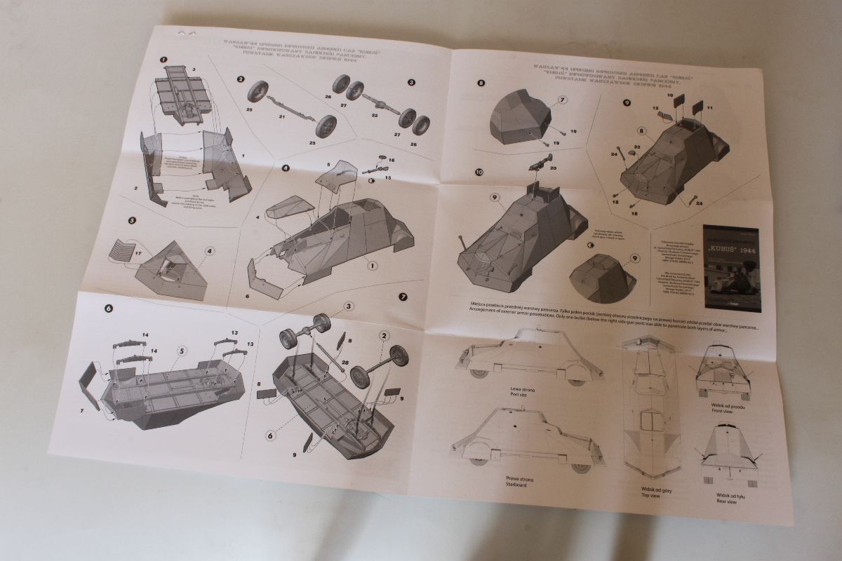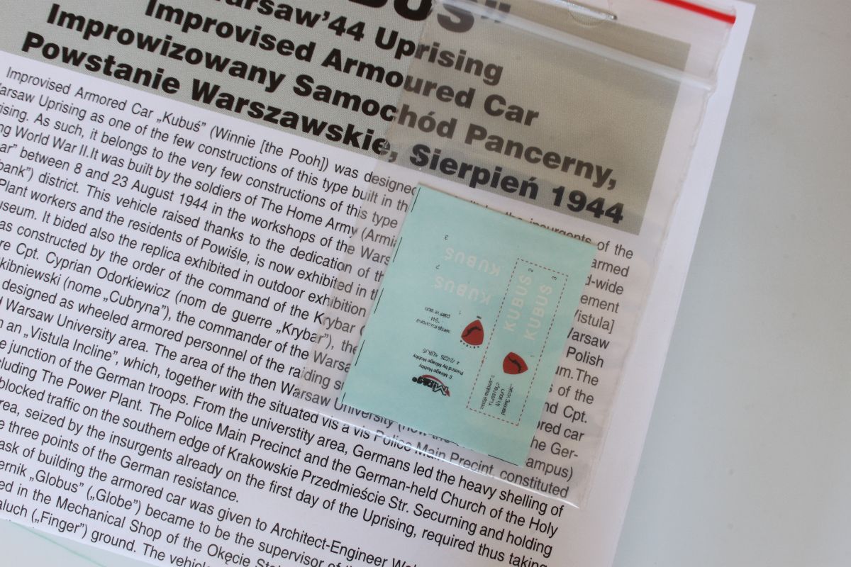 W instrukcji (ładnie wydrukowanej na papierze kredowym) znajdziemy bardzo obszerny opis historii Kubusia, rysunki montażowe oraz kolorowy schemat malowania. Siłą rzeczy, poza rysunkami montażowymi stanowią one kopię tego co znajdujemy w instrukcji Kubusia w skali 1/35 Tabelę kolorów opracowano na podstawie palety Vallejo. Dysponujemy także schematem rozmieszczenia przestrzelin. Schematy montażu opracowane zostały czytelnie, dzięki czemu poszczególne etapy budowy nie powinny sprawić problemu. Zawierają również konkretne uwagi ułatwiające klejenie. Dołączona do zestawu kalkomania zawiera dwa warianty oznaczeń.