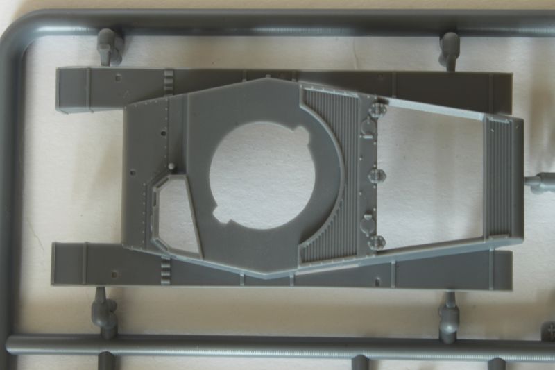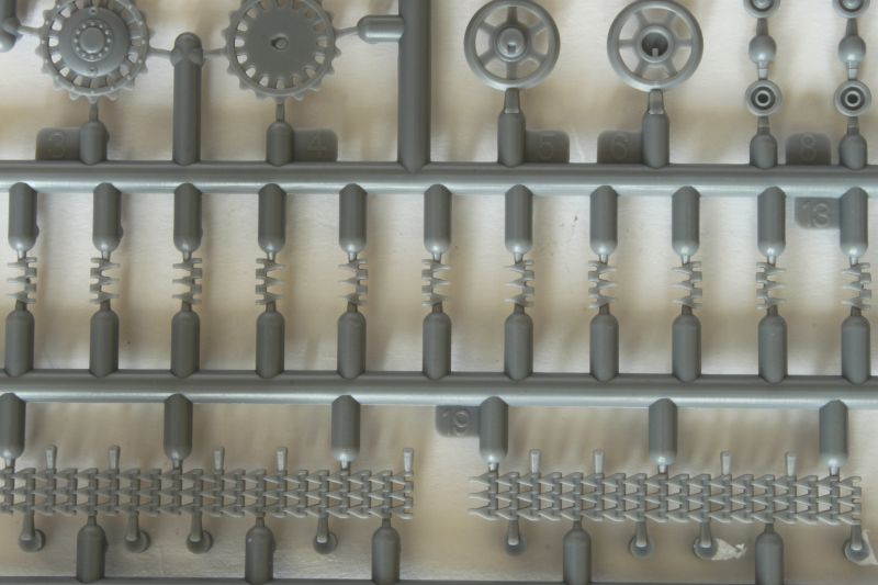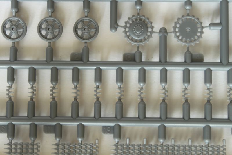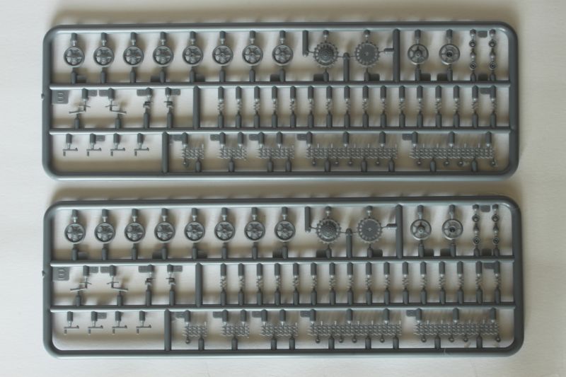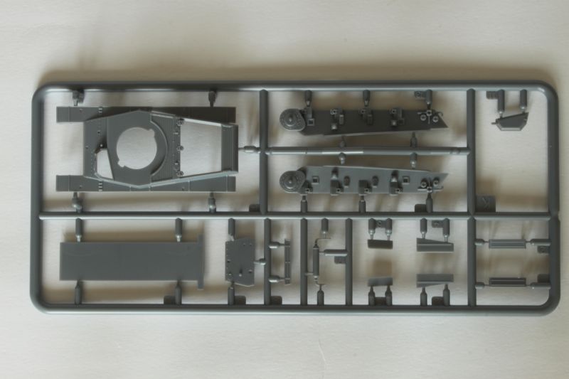 Zasadnicze elementy modelu zgrupowane są w pięciu ramkach z ciemnoszarego tworzywa, z czego jedna, zawierająca układ napędowy jest podwójna. Dysponujemy przeszło setką części, a producent poprzestał jedynie na odtworzeniu zewnętrznej bryły pojazdu. Model jednak jest przygotowany w taki sposób, że modelarze posiadający odpowiednią dokumentację i chcący się pobawić w budowę pojazdu z wnętrzem, mają ułatwione zadanie. Wszystkie bowiem pokrywy włazów czy pokryw w przedziale silnikowym wykonano jako oddzielne elementy. Gąsienice wykonano jako ogniwkowe, co jest obecnie standardem, co prawda w tym modelu, prawidłowy ich montaż wymaga wiele precyzji i uwagi.