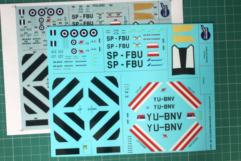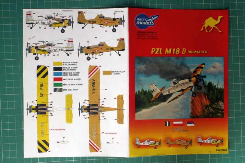 Model możemy wykonać w jednym z trzech wariantów malowania, czyli Greckich Sił Powietrznych (w Grecji samoloty przeciwpożarowe są składnikiem lotnictwa wojskowego), polskich, a konkretnie maszyny SP-FBU ze stała bazą na lotnisku w Goleniowie pod Szczecinem oraz Serbii. Maszyny greckie i polskie maja ten sam schemat malowania, biało – żółto – czarny i różni się właściwie jedynie znakami przynależności państwowej oraz oznaczeniami. Samolot w malowaniu serbskim ma jednolite malowanie kremowo – żółte z czarnymi i biało czerwonymi elementami ozdobnymi. To wszystko uwzględnia spory arkusz kalkomanii, na którym znajdziemy zarówno oznaczenia, napisy i wszystkiego rodzaju stencile, a także ukośne pasy na końcówkach skrzydeł oraz czarno – beżowe oznaczenia na masce kadłuba przed kabiną. Kalkomania sprawia pozytywne wrażenie, druk jest wyraźny, bez widocznych przesunięć i błędów drukarskich. Także kolorystyka nie budzi zastrzeżeń. Jakie są jednak naprawdę, wyjdzie podczas ich nakładania na model. Kalkomania została także powtórzona na papierze, taki schemat w razie problemów z odcyfrowaniem przeznaczenia danego elementu.
