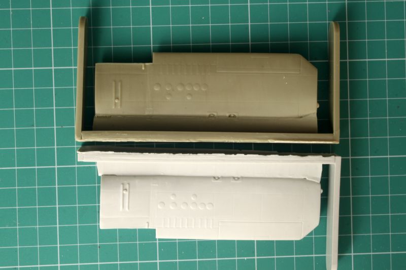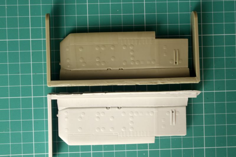 Producent zastosował klasyczny podział na lewą i prawą połówkę, maskę oraz powyżej omówioną część przednią. Niestety pojawia się tu pierwszy zonk, ponieważ połówki są zwichrowane i nie chcą pasować ze sobą. Nie rozkminiłem, czy żywica, czy wydruk 3D. Jeżeli to pierwsze, to nie ma problemu, trochę gorącej wody załatwi sprawę, jeśli wydruk 3D czeka nas dość skomplikowana opresja klejenia na raty. Połówki kadłuba mają bardzo ładnie odtworzoną fakturę powierzchni. Linie podziału są oczywiście wgłębne i delikatne ale wyraźne. Podobnie nity. Poza tym jest całkiem sporo pokryw, paneli, listew i stopni. Trzeba jednak zwrócić uwagę na ich układ w konkretnym egzemplarzu. Producent zapewne opracowując model wzorował się na którymś z egzemplarzy używanych w Grecji. Układ stopni na lewej burcie jest właśnie taki, jak wykonało Grand Models, ale już polskie egzemplarze są inne. Trzeba zatem sprawdzić, przy wyborze konkretnego egzemplarza, którego replikę będziemy budować. W wewnętrznych częściach połówek kadłuba zaznaczono elementy wyposażenia kokpitu. Zrobiono to jednak w sposób szczątkowy i warto to uzupełnić, zwłaszcza jeśli mamy w planach otwartą kabinę.
