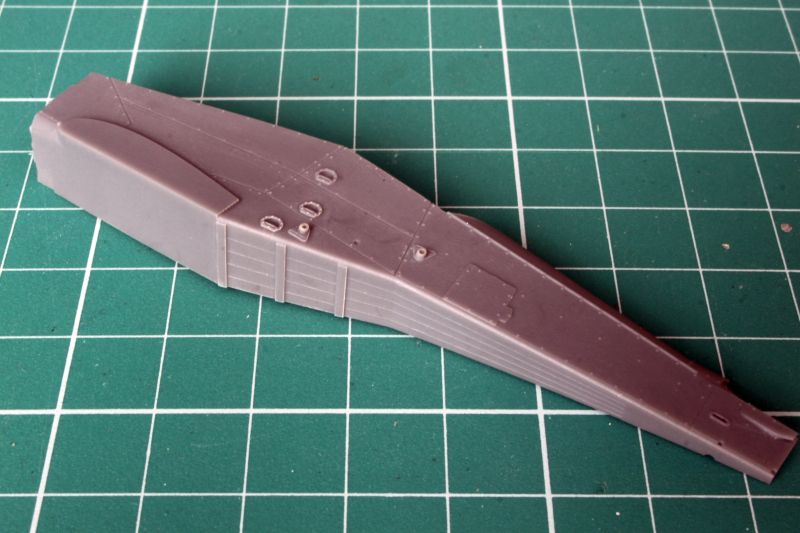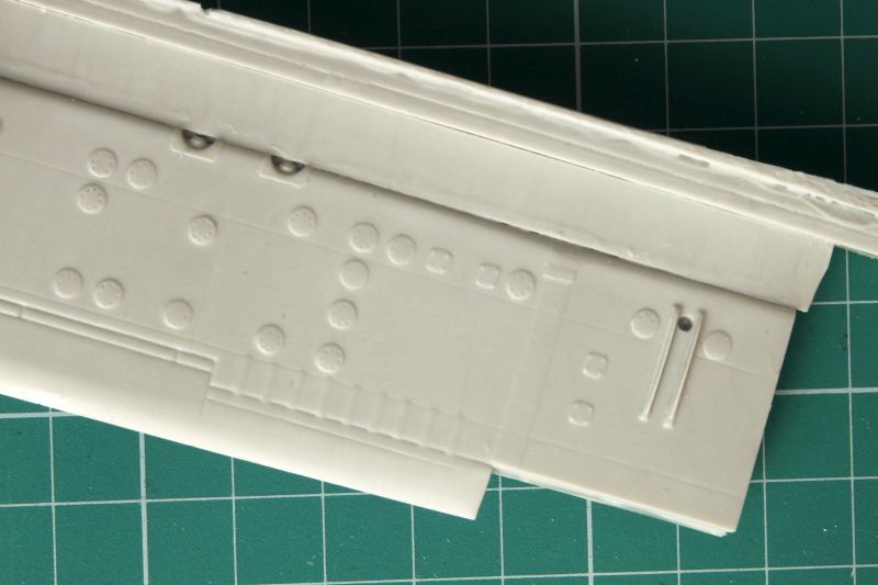 Skrzydła wykonano jako pojedyncze odlewy żywiczne, przy czym wlewy technologiczne znajdują się na krawędzi natarcia. Czeka nas zatem obróbka. Linie podziału są wklęsłe i bardzo delikatne, w niektórych miejscach zanikają. Także warto rozważyć przerycie ich na nowo. Tak czy inaczej, warto je przetrzeć drobnym papierem ściernym delikatnych rys znajdujących się na całej powierzchni. Na szczęście ładnie poddają się obróbce, sprawdziłem przy okazji pisania;) Także okrągłe pokrywy, których dość sporo jest zarówno na górnej jak i dolnej powierzchni płata, są nieco za bardzo wypukłe i przeszlifowanie ich powinno wyjść na dobre naszej replice. Trzeba także usunąć z górnej powierzchni płata szereg pionowych, krótkich listew, znajdujących się przy klapach. Znajdują się one tylko na dolnej powierzchni płatów. To właściwie jedyne uwagi, ale mając dobrą dokumentację, można pokusić się o odtworzenie także szeregu drobnych detali i wykonanie wszystkich powierzchni sterowych jako oddzielnych, jednak nie jako wychylonych. Wystarczy spojrzeć na zdjęcia oryginału. Ponieważ oba skrzydła to jednolite odlewy, które są dość ciężkie, warto wzmocnić ich mocowanie do kadłuba, np. jakimiś kawałkami drutu, a nie przyklejać ich na styk. W skrzydłach mamy zaznaczone otwory, które trzeba pogłębić, a w takich samych miejscach nawiercić otwory w kadłubie.