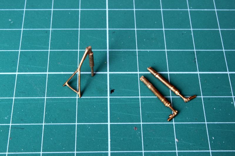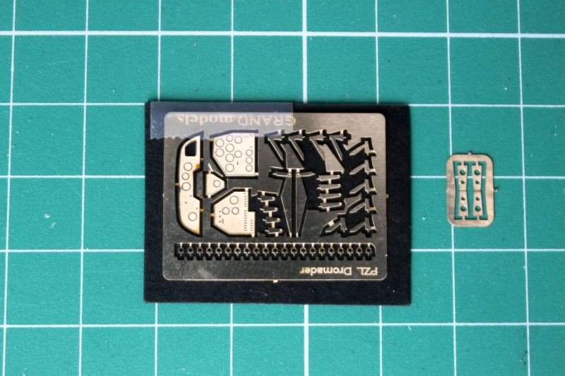 Podstawowe elementy, czyli żywica są uzupełnione multimediami, jak się to ładnie określa. Elementy fototrawione to obecnie standard i Grand Models się od tego nie wyłamują. Do swojego modelu Dromadera dołożyli dwie blaszki, jedną większą, na której znajdują się tablice przyrządów, mechanika płata i temu podobne drobne detale. Zabrakło natomiast pasów fotela pilota oraz całkiem sporej ilości uchwytów w rejonie osłony kabiny i przedniej części kadłuba. Z tymi ostatnimi należałoby jednak upewnić się, czy przypadkiem grackie maszyny tez mają takie uchwyty. Na szczęście dorobienie ich we własnym zakresie nie jest jakimś karkołomnym wyzwaniem. Tablice przyrządów wykonano jako jednolite panele, nie wykonano w nich otworów pod zegary, a tych nie znajdziemy na nawet na kalkomanii. Musimy się posiłkować zatem zapasami z podręcznego magazynku. Druga blaszka to z kolei widelce amortyzatorów goleni podwozia. Same golenie wykonano z metalu, zresztą bardzo ładnie. Są dosyć szczegółowe i co najważniejsze takie rozwiązanie jest idealne dla ciężkich, żywicznych skrzydeł. Podwozie takie się nie powinno złamać. Kolejna grupa detali to wykonane z pomarańczowego tworzywa stopnie ułatwiające wchodzenie do kabiny, drążek sterowy i rurka pitota. W taki sposób wykonano także jeden z detali urządzenia do zrzutu wody/chemikaliów. W Polskich Dromaderach jego kształt jest nieco inny niż przewidział to producent, więc koniczna będzie korekta.
