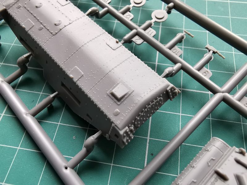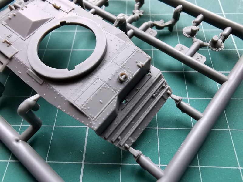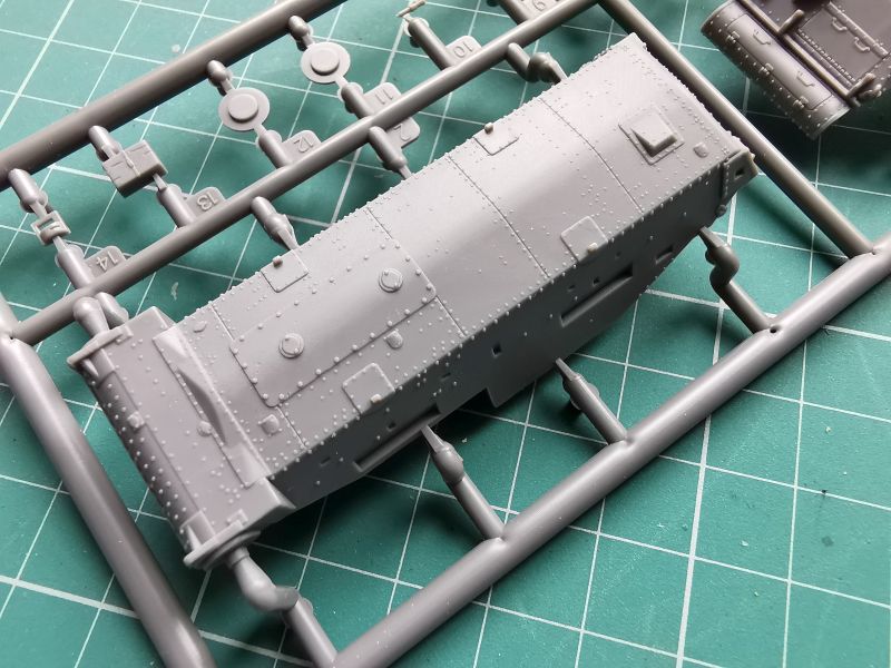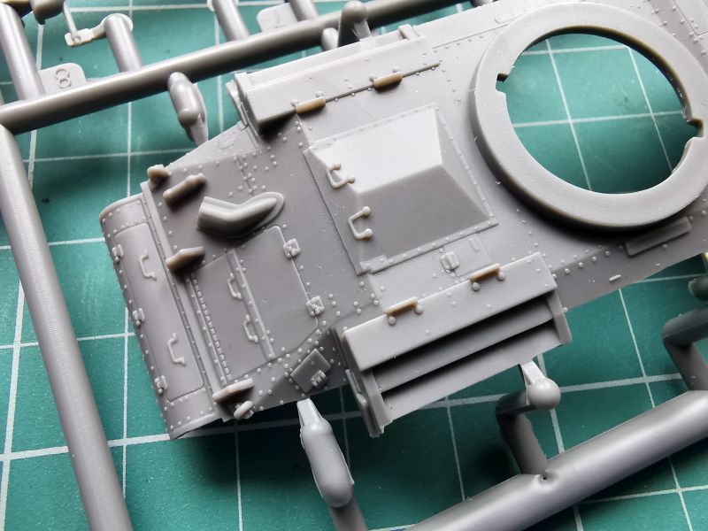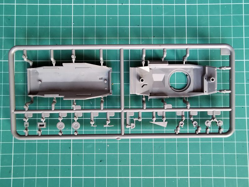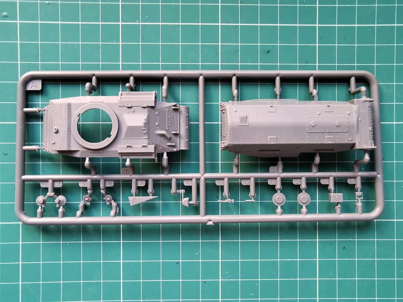 Zestaw składa się z sześciu ramek wtryskowych wykonanych z jasno szarego polistyrenu. Ramka oznaczona jako „A” zawiera kadłub pojazdu oraz kilka drobnych detali. Od razu zwraca uwagę kadłub pojazdu a dokładniej niezwykle szczegółowe odwzorowanie jego detali i szczegółów. Wszelkiego rodzaju pokrywy uchwyty, nity i temu podobne detale w mojej ocenie są odwzorowane po prostu po mistrzowsku, co więcej projektant nie odpuścił sobie także szczegółów podwozia. Gdyby ktoś mi z zaskoczenia pokazał powyższe zdjęcia, nie mówiąc do dokładnie przedstawiają, myślałbym, że to model w skali 1/35 a nie 1/72.
