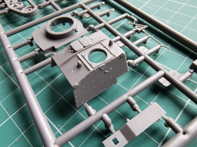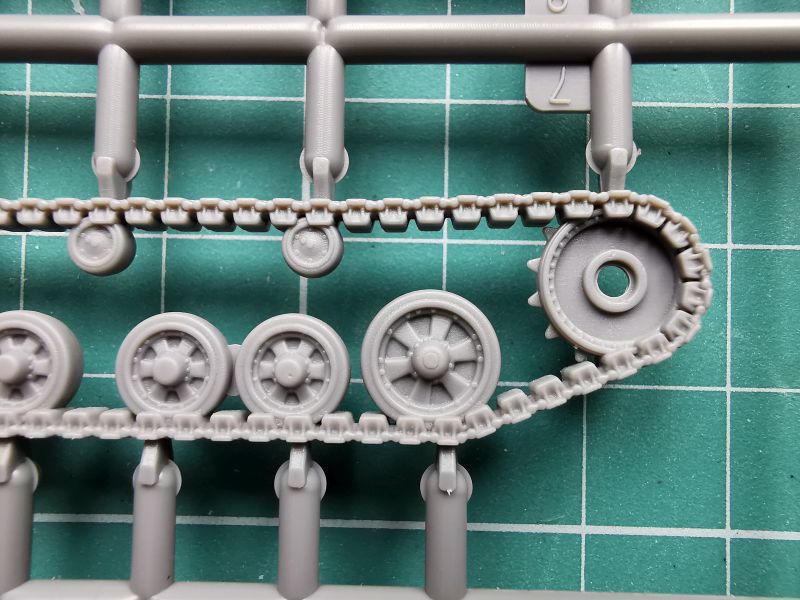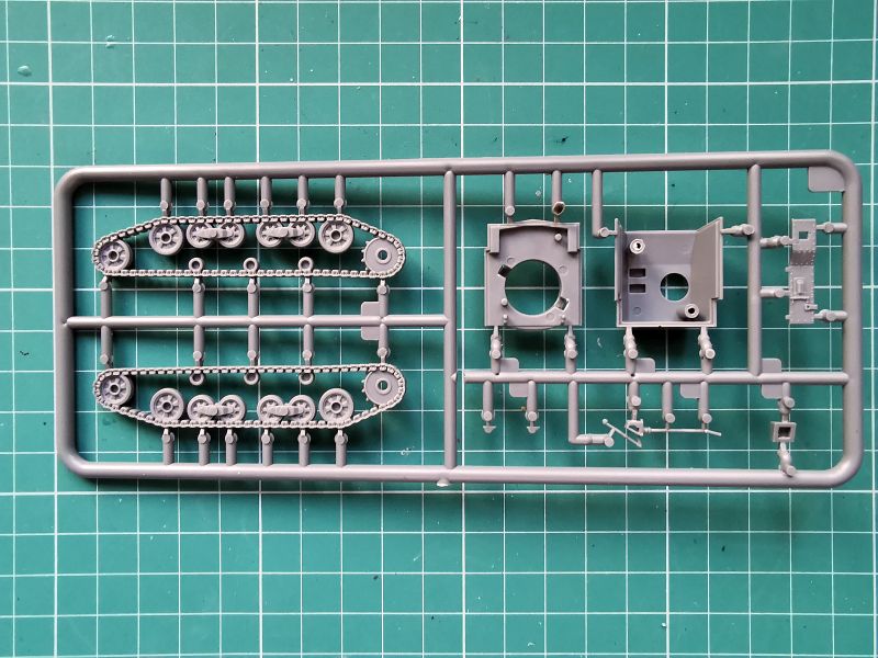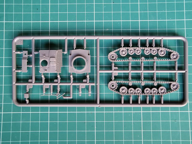 Podobnie jest zresztą w przypadku pozostałych ramek. Ta oznaczona jako „B” zawiera podzespoły wieży oraz układu jezdnego. Także tu projektant nie idzie na skróty, pomimo iż układ jezdny zaprojektowano w typowy dla „gazetowych” modeli w postaci kół wraz gąsienicami. Tu także wystarczy przyjrzeć się szczegółom kół, gąsienic czy detalom wieży.