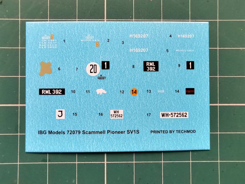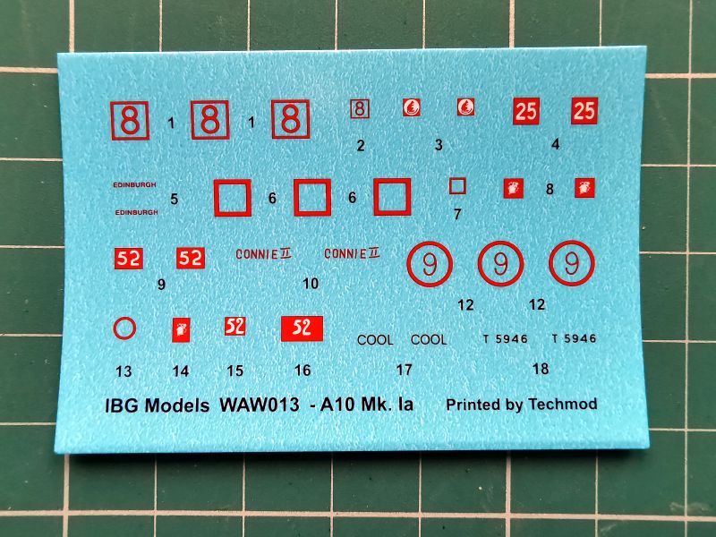 Kalkomania to dość spory jak na tę skalę arkusik na którym znajdziemy kalkomanie umożliwiające wykonanie kilku pojazdów wchodzących w skład tej samej jednostki. Tradycyjnie kalkomanie wykonała firma Techmod.