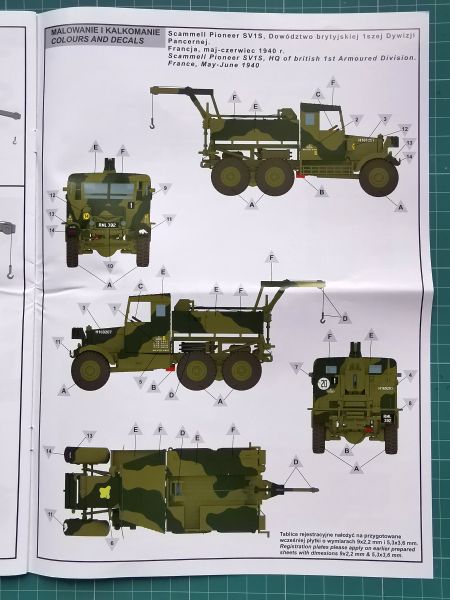 Jak zaznaczyłem powyżej model można wykonać w jednym z dwóch malowań. Pierwsze z nich to pojazd przynależny do Dowództwa I Brytyjskiej Dywizji Pancernej z okresu jej funkcjonowania w ramach Korpusu Ekspedycyjnego w e Francji w maju i czerwcu 1940r. Drugie malowanie może być pewnym zaskoczeniem, zresztą nawet już po obejrzeniu boxartu, ponieważ obok pojazdu stoją żołnierze niemieccy. Tak, mamy możliwość wykonania miniatury pojazdu zdobycznego i to z Frontu Wschodniego, z jakiegoś bliżej nie zidentyfikowanego batalionu naprawczego z lat 1941 – 1943. Schematy malowania mają tradycyjnie już kolorowych plansz, które zamieszczono na końcu instrukcji.