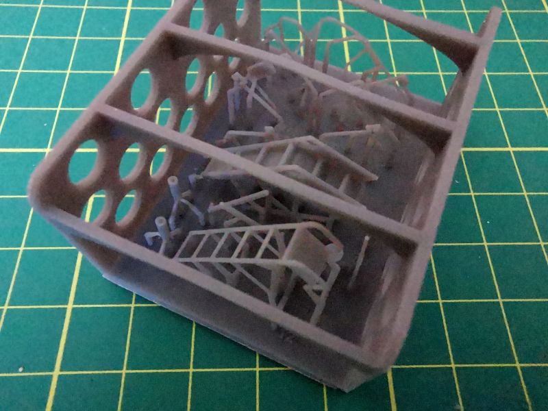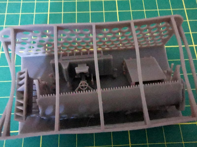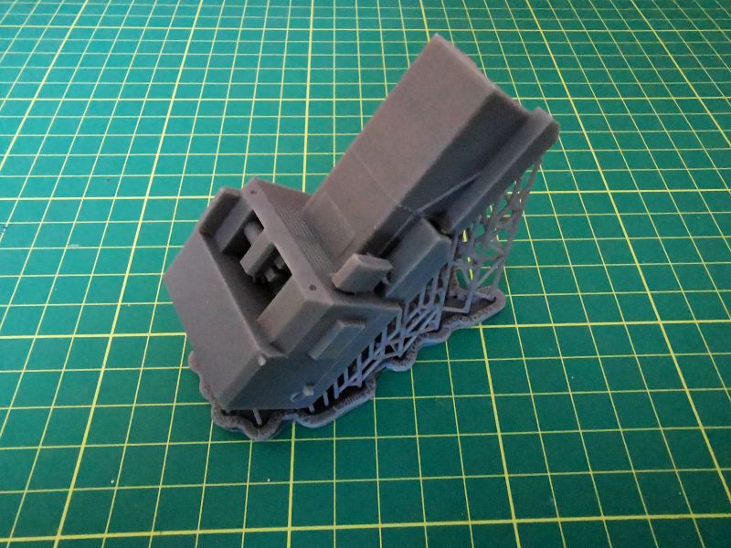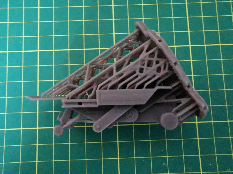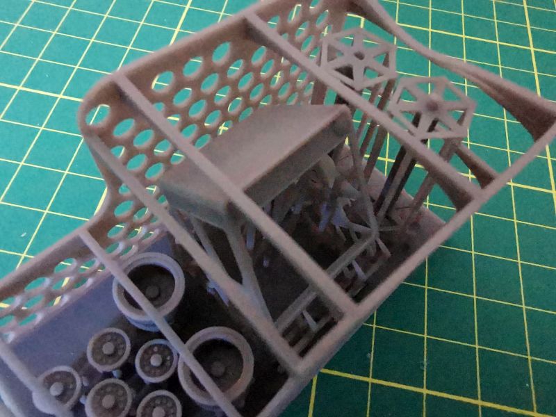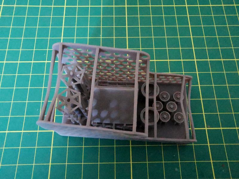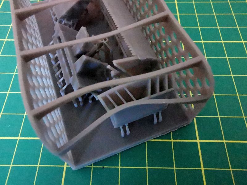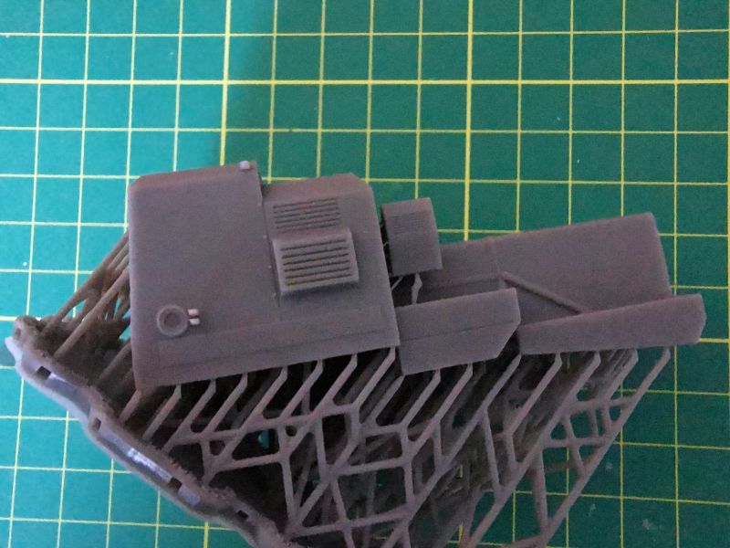 Dwa nieco mniejsze wydruki zawierają elementy kabiny, zespołu tnącego (hedera) oraz urządzenia do zrzutu słomy. Żeby się do nich dobrać trzeba najpierw usunąć boczne, ażurowe ścianki wydruków i łączące je suporty, służące jako zabezpieczenie delikatnych przecież elementów i dopiero wtedy zabrać się za wycinanie poszczególnych podzespołów. To jest najbardziej wymagający i newralgiczny etap budowy, niewłaściwe obchodzenie się z wydrukami może spowodować uszkodzenie detali.