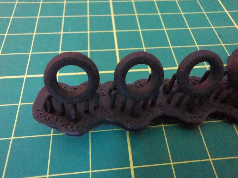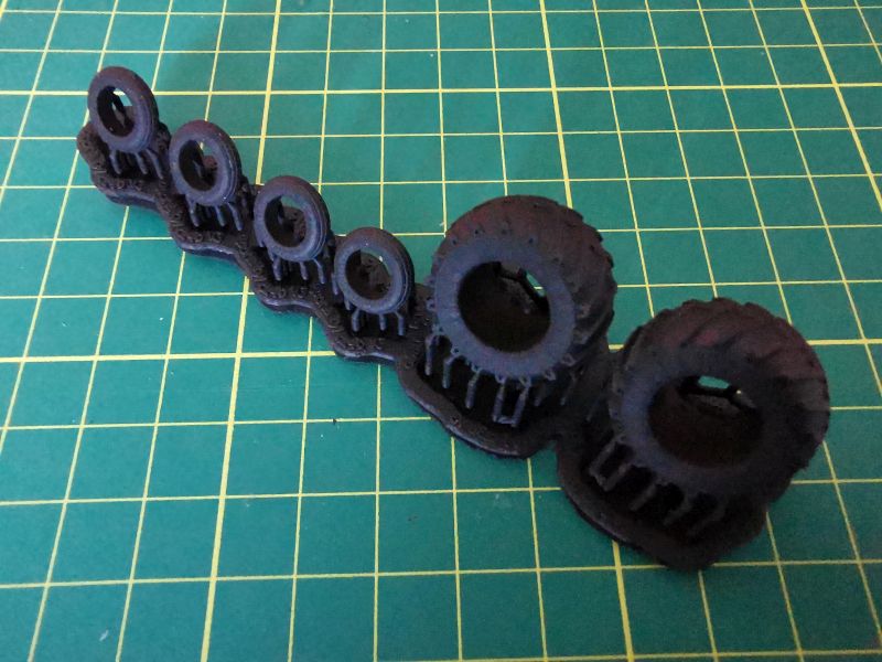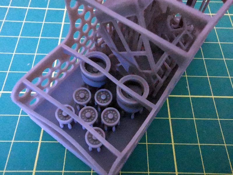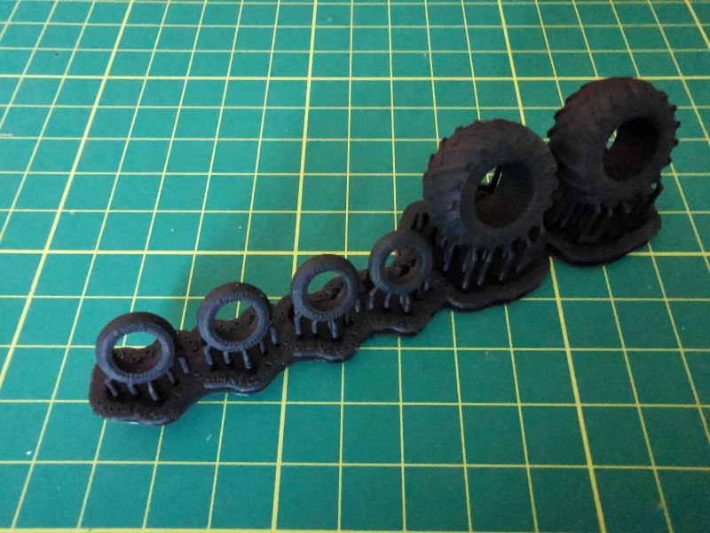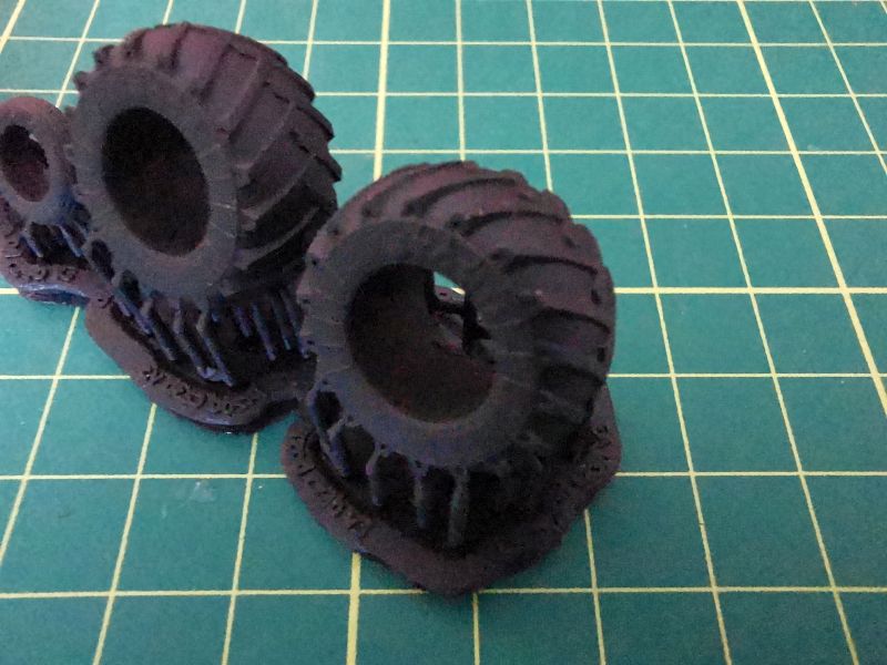 Opony kół wydrukowano z żywicy w kolorze czarnym. Mają one wszystko, co potrzeba, bieżniki prawy i lewy a także oznaczenie producenta czyli Stomilu. Można je oczywiście tylko wyciąć i bez malowania zamontować w modelu, jak jednak raczej je pomaluję jakimś kolorem bardzo ciemno szarym, żeby nabrały jeszcze większego realizmu.