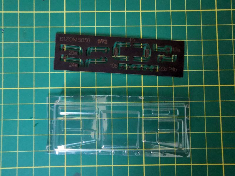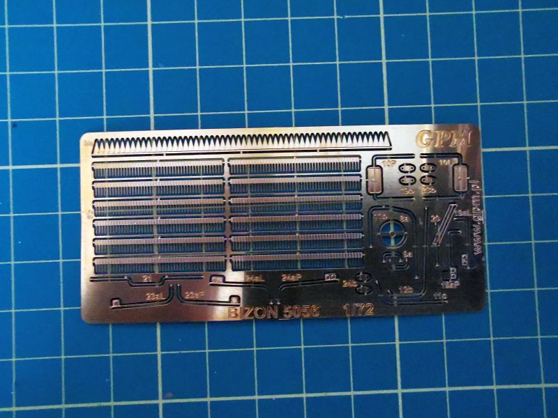 Na zdjęciu z prawej strony widoczna jest blaszka fototrawiona, którą GPM sprzedaje oddzielnie. Poza uchwytami poręczami, które są właściwe powieleniem zawartości kartonika, znajdziemy tam też nagarniacze czyli elementy tnące hedera, kierownicę oraz kilka innych pożytecznych drobiazgów. W zestawie nie znajdziemy kalkomanii. Producent także oferuje je jako osobne akcesoria, te do Bizona na razie jeszcze nie powstały.