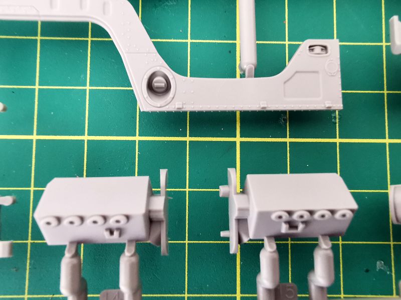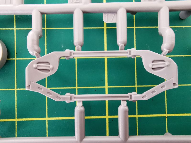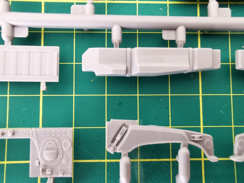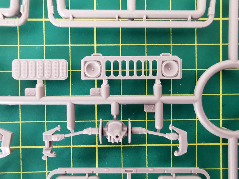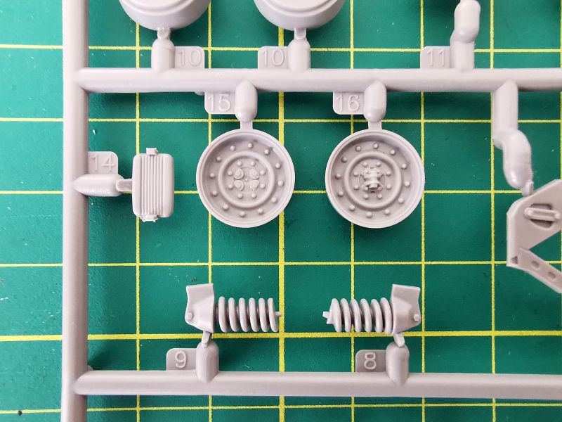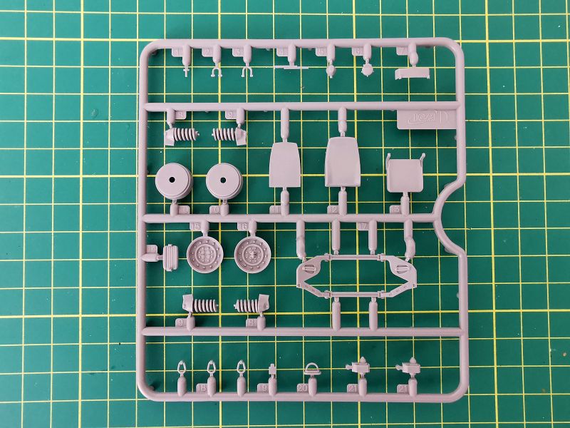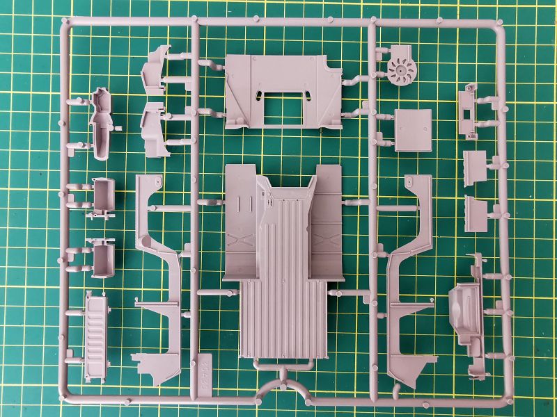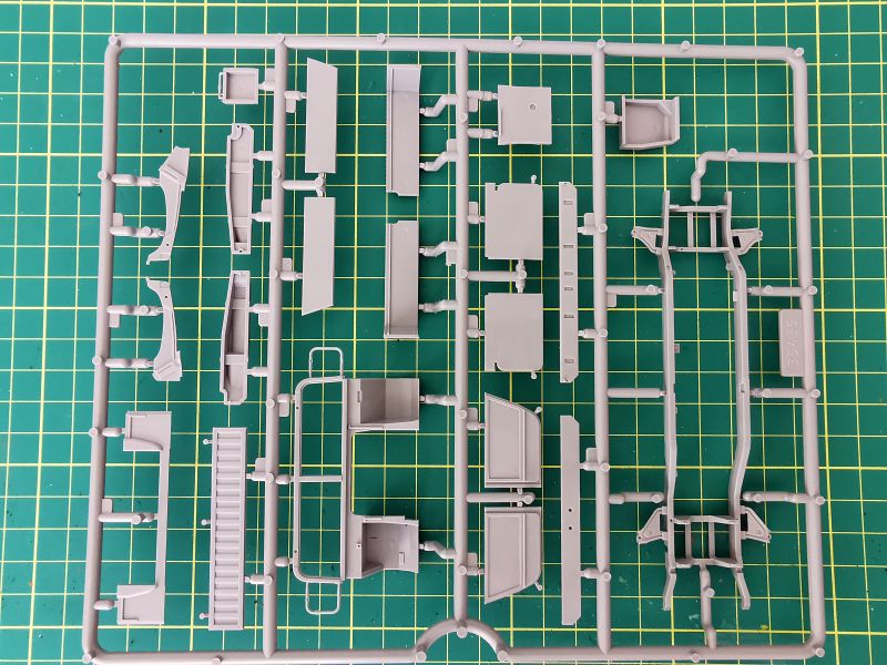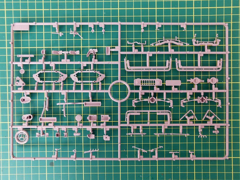 Zasadnicze elementy zestawu zostały rozmieszczone na pięciu ramkach z szarego polistyrenu, takiego jakiego to ICM używa od dawna. Producent ten rozmieszcza poszczególne detale na wypraskach, jak akurat ma miejsce. Dlatego też na ramce oznaczonej jako „A” znajdziemy zarówno podzespoły podwozia, jak i nadwozia pojazdu.