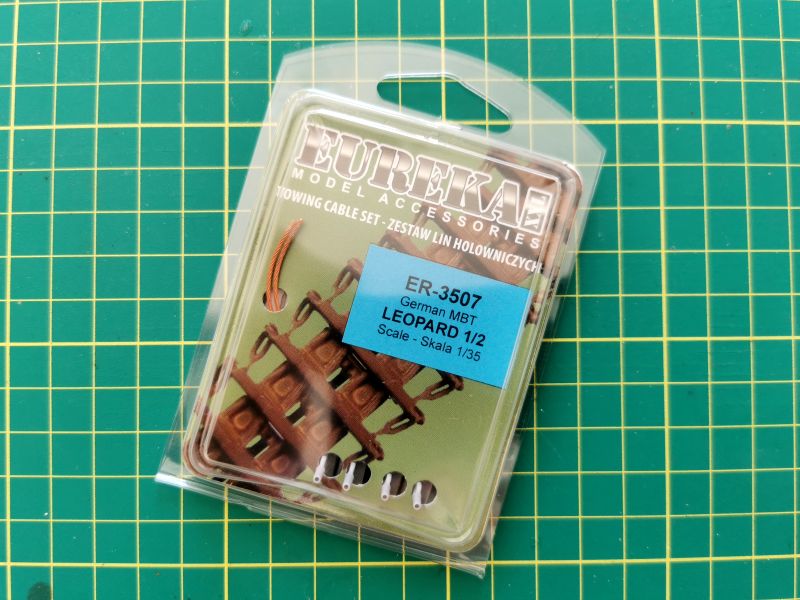 Przy okazji omawiania modelu czołgu Leopard 2A6 wspominałem, iż zdecydowanie najsłabszym punktem tego zestawu są winylowe imitacje lin holowniczych, które aż się proszą o wymianę. Jeżeli nie chcemy wykonywać ich samodzielnie, możemy posiłkować się zestawem takich lin oferowanych przez firmę Eureka XXL. Pasują one nie tylko do modeli czołgów Leopard 2, ale także jego poprzednika, Leopard 1. Liny te są zapakowane w charakterystyczny blister, bardzo estetyczny i czyta lenie opisany.