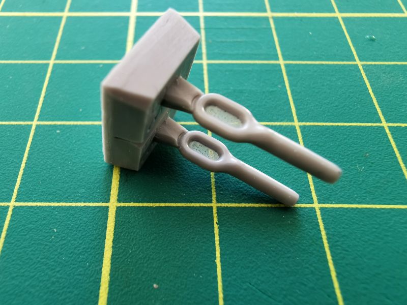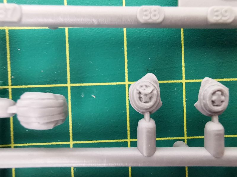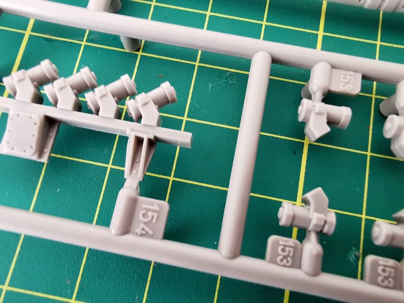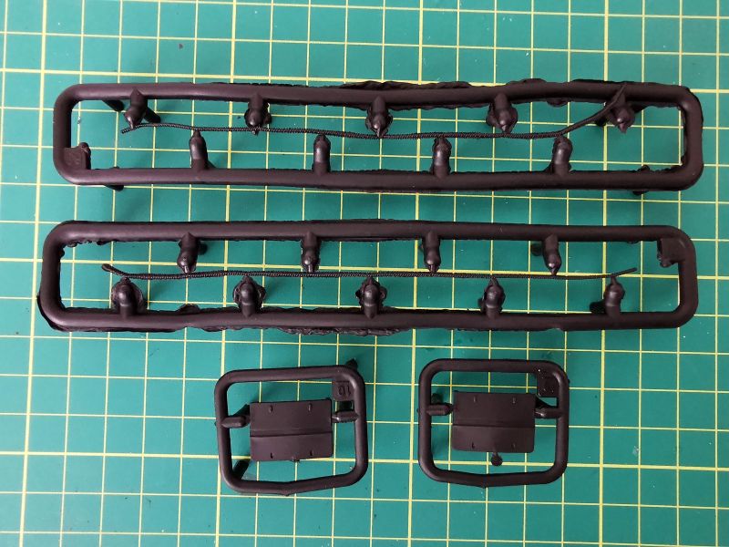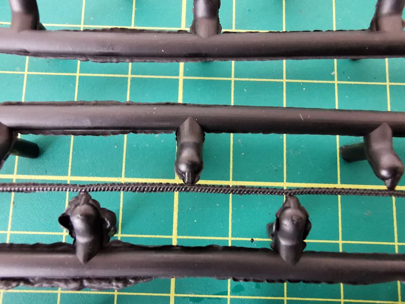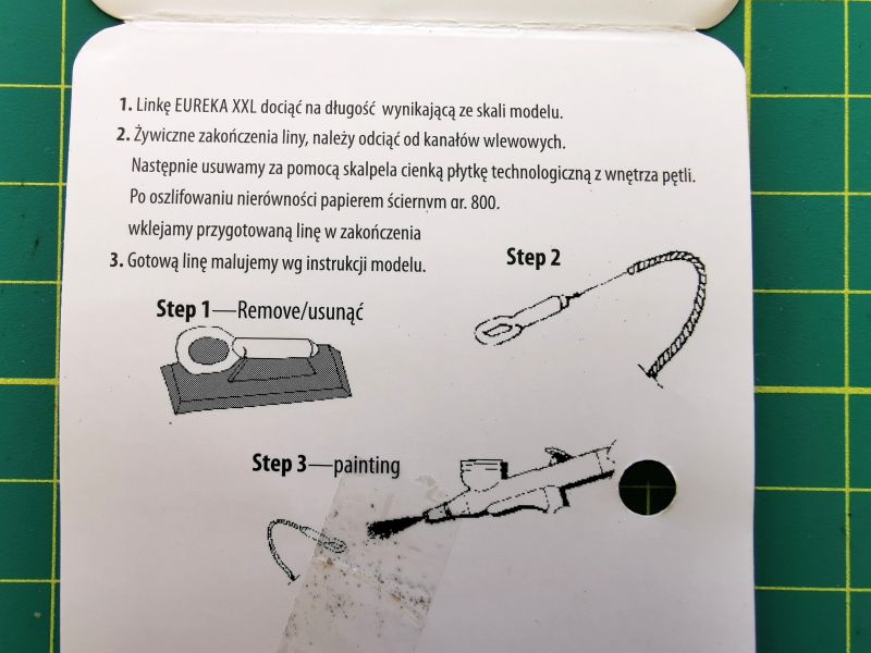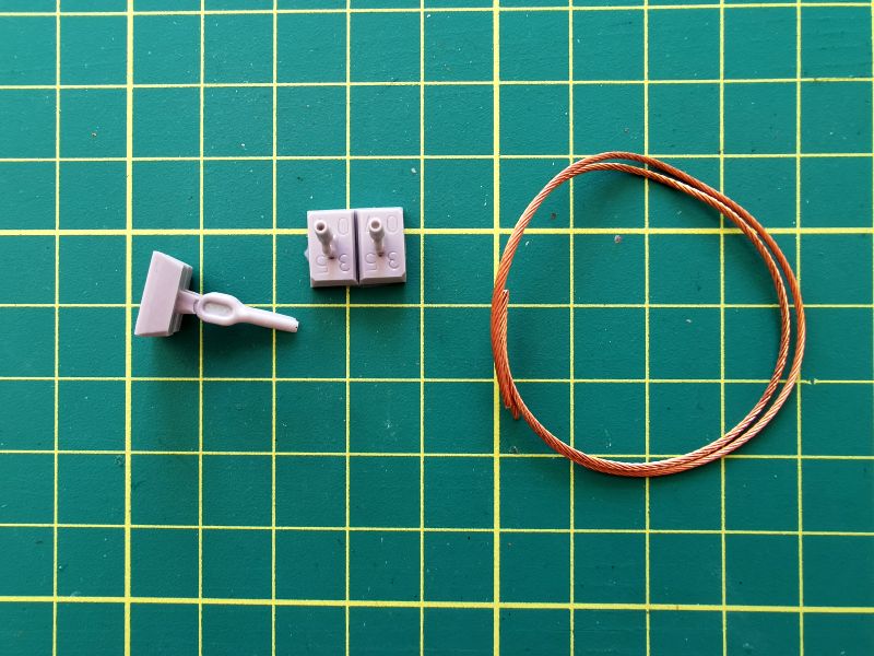 W oparciu o niego możemy wykonać jedynie dwie liny, nie ma tam dodatkowych akcesoriów. Mamy zatem dwa odlewy z szarej żywicy. Na nich znajdują się żywiczne końce lin, do tego dochodzą dwa odcinki cienkiej linki stalowej. Wystarczy wyciąć i oczyścić z resztek żywicy zakończenia a następnie wkleić w otwory na końcach, końcówki linek, pomalować i cała filozofia.