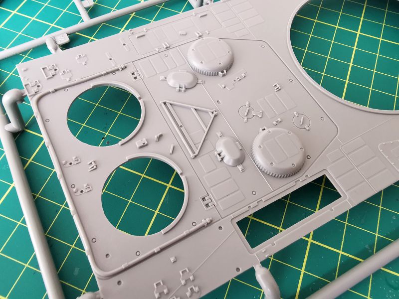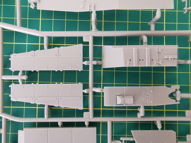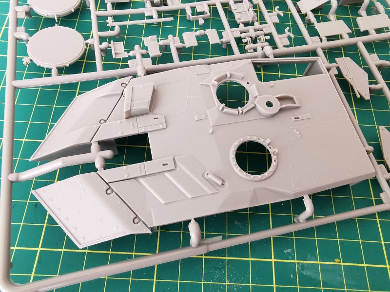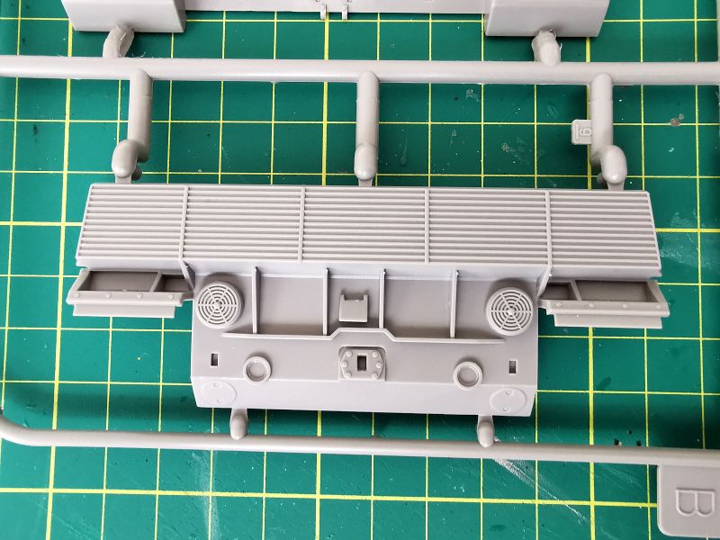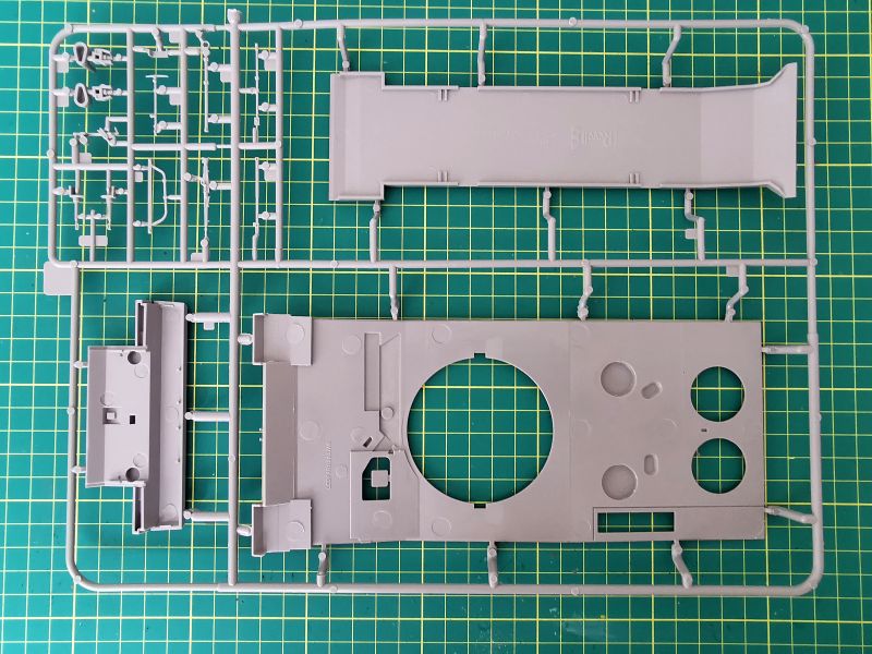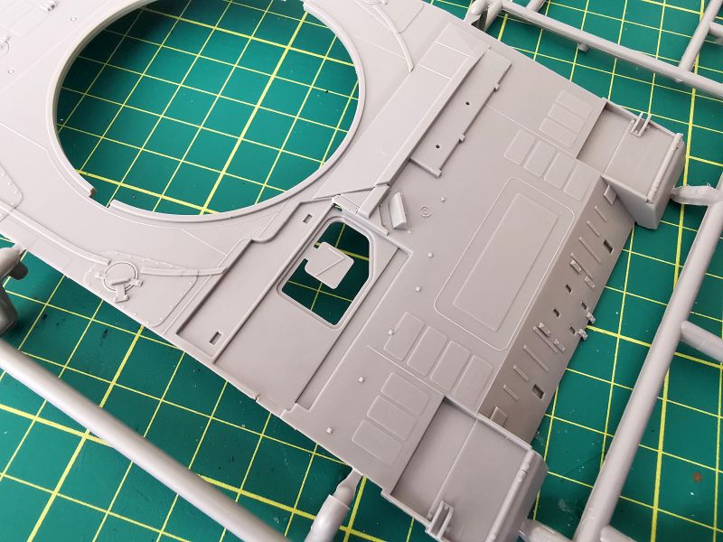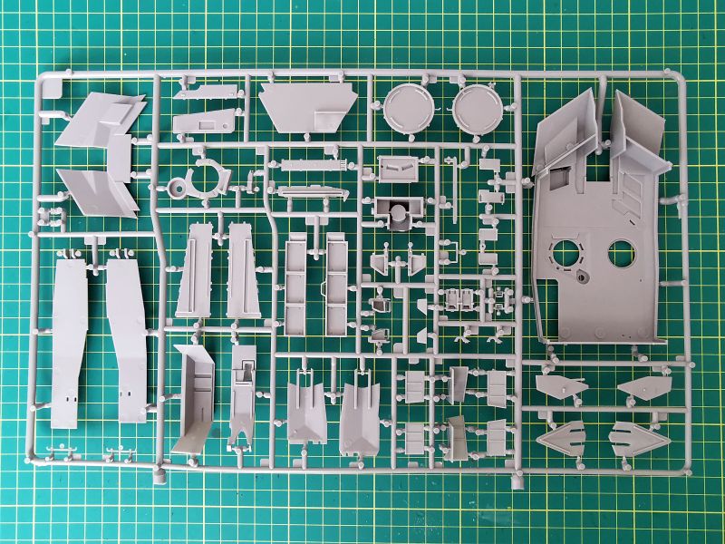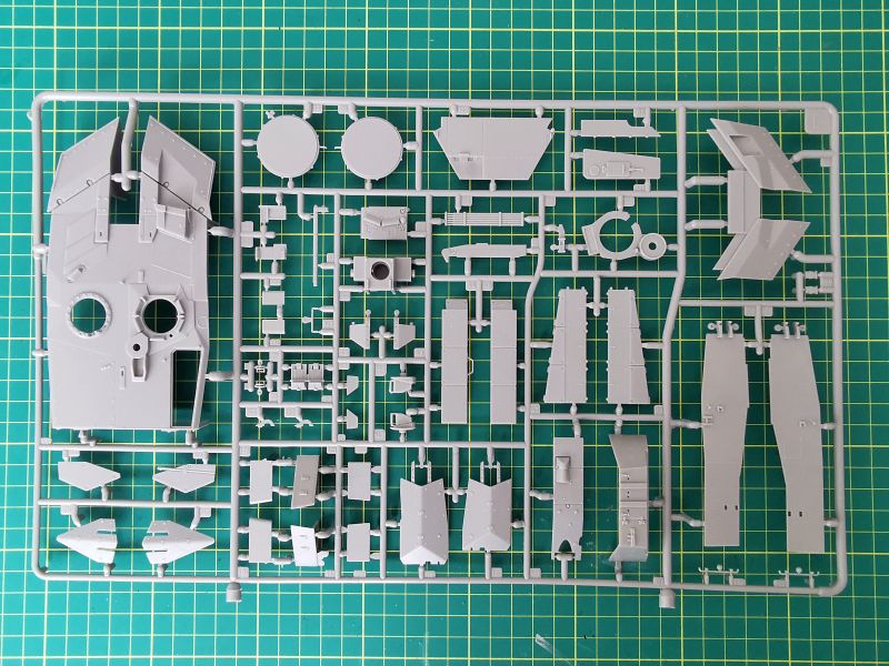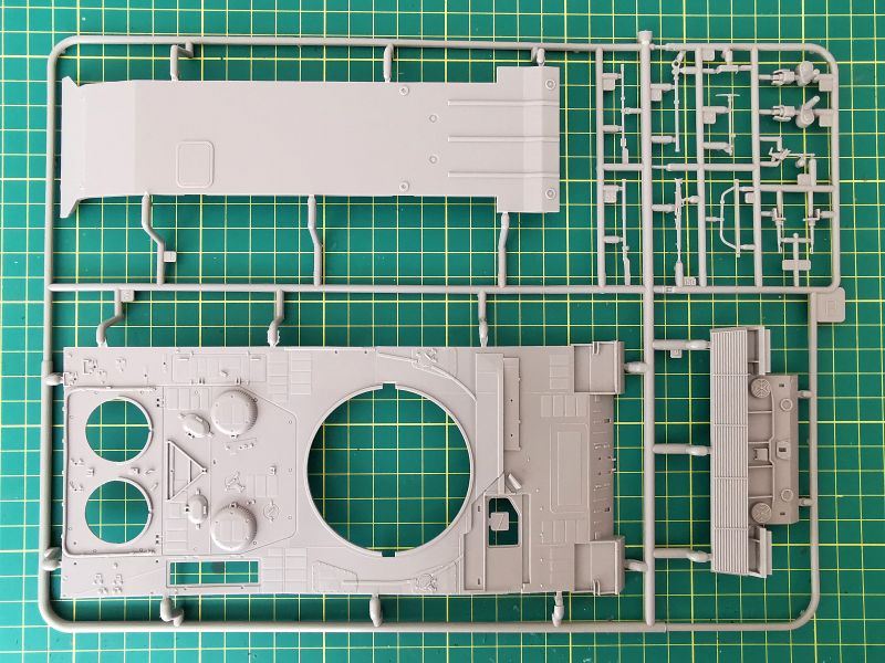 Zestaw Revella to dziewięć wyprasek wykonanych z szarego tworzywa. Trzy z nich są duże, pozostałe mniejsze lub znacznie mniejsze. Jednej z nich nie wykorzystamy wcale. Pierwsza trafiła mi pod obiektyw ramka „B” na której znajduje się górna część kadłuba, podłoga, tylna część oraz trochę drobnych detali. Muszę przyznać, że jestem pod dużym wrażeniem odwzorowania szczegółów konstrukcji czołgu. Detale wyraźne i poprawnie odtworzone. Podział technologiczny tego modelu też wygląda na dobrze przemyślany, z budową nie powinno być problemów chyba, że podczas klejenia wyjdą jakieś problemy ze spasowaniem poszczególnych elementów. Jak wspominałem, zestawu po prostu nie znam, nie wymieniałem też uwag na jego temat z innymi modelarzami.