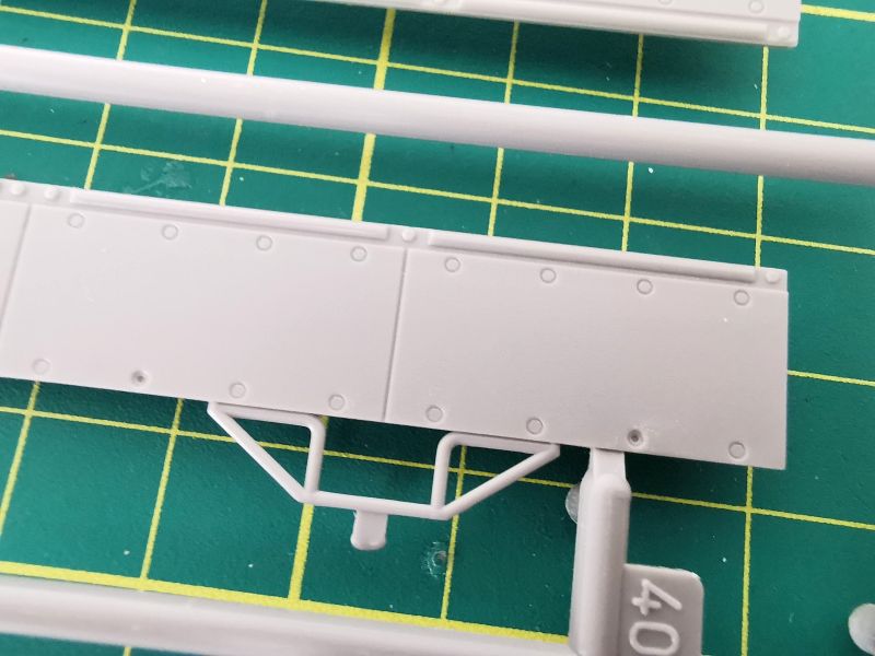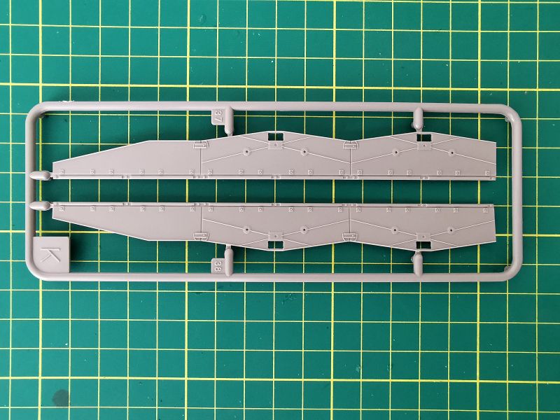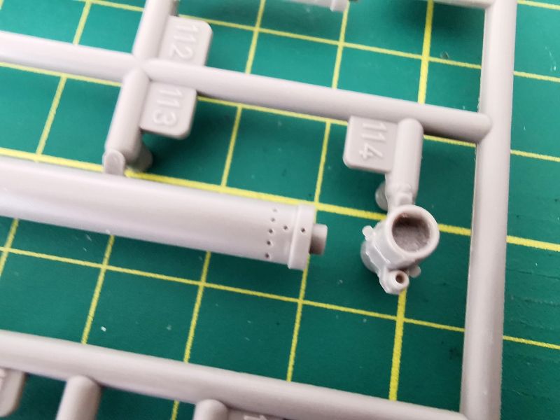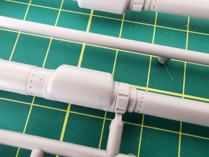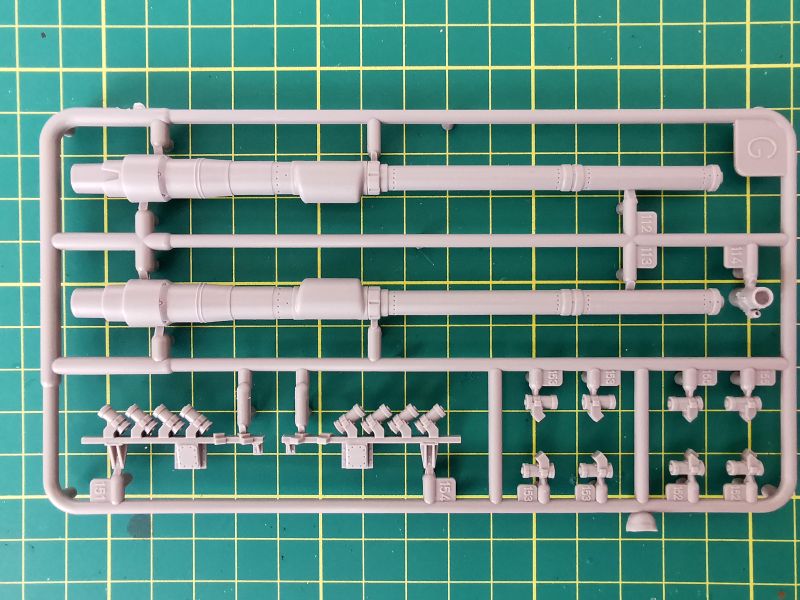 Pierwsza z mniejszych wyprasek ma oznaczenie „K”. Na niej znajduje się lufa armaty oraz wyrzutniki granatów dymnych. Muszę przyznać, że detale lufy zrobiły na mnie bardzo pozytywne wrażenie i raczej śmiem wątpić w sens wymiany tej lufy na metalową czy drukowaną. Wystarczy ją poprawnie skleić i nie uszkodzić podczas obróbki miejsc łączenia delikatnych detali lufy.
