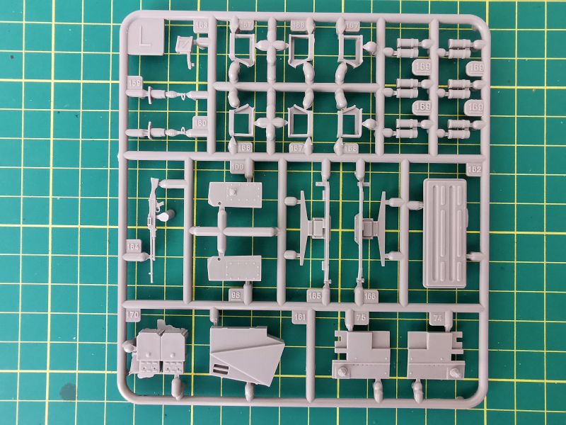 Z wypraski „L” użyjemy tylko dwóch elementów – 159 i 160. Widoczne są w górnej części wypraski po lewej stronie. Reszta zasili nasz magazynek części zapasowych, po prostu są przeznaczone dla innych odmian Leoparda 2.