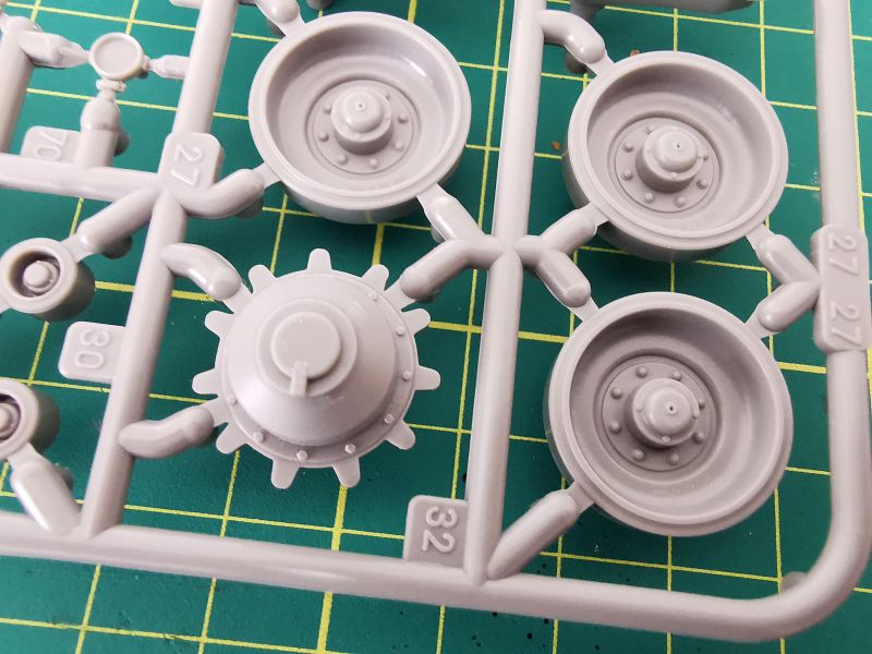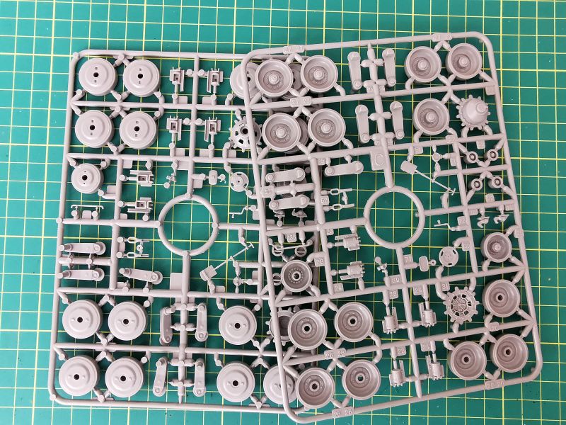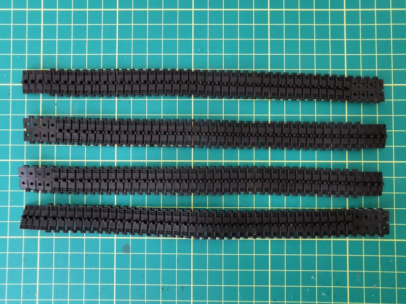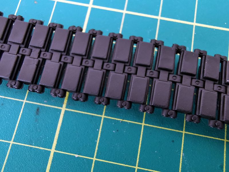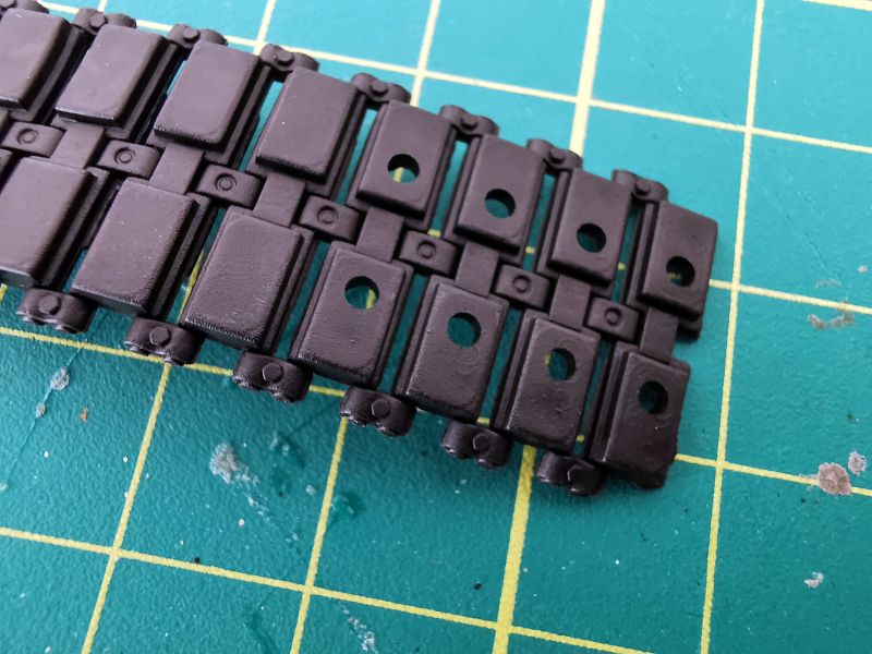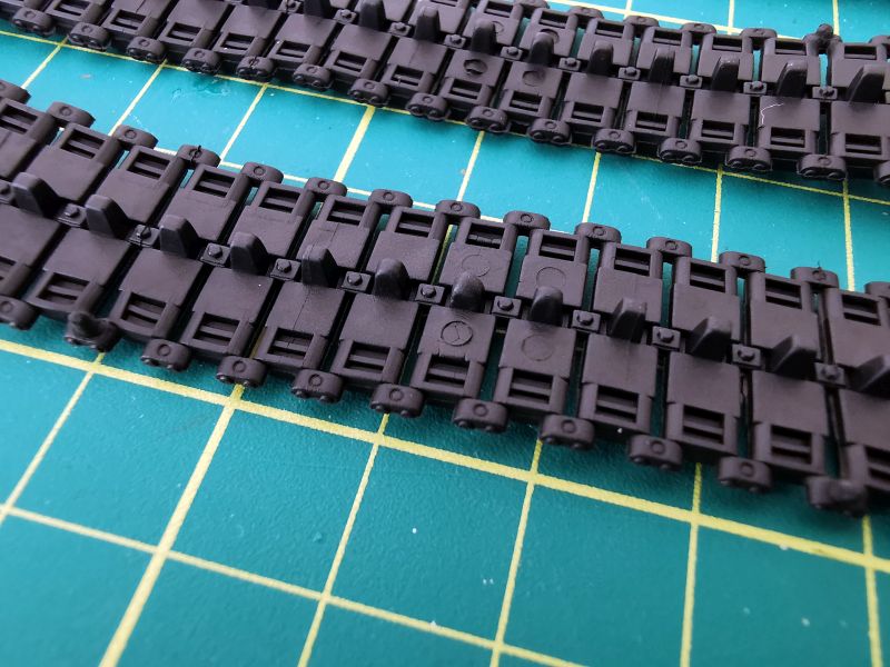 Gąsienice mają postać pasków z czarnego winylu. Na jedną gąsienice składają się dwa takie paski, krótszy oraz dłuższy. Odwzorowanie szczegółów gąsienicy jest poprawne i całkiem ładnie oddaje jej szczegóły. Zapewne większość modelarzy będzie wolała gąsienice ogniwkowe i pracujące do tego, ale na razie moje potrzeby zupełnie zaspokajają te wchodzące w skład zestawu. Na razie, bo może zmienię zdanie w czasie budowy.