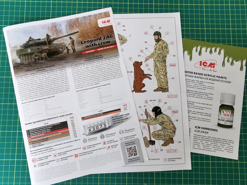 Jest to pojedyncza ramka, a właściwie dwie połączone z sobą ramki zapakowane w osobną foliową torebkę. Na większej z nich znajdują się elementy do wykonania pięciu figurek czołgistów i oczywiście psa. Na drugiej mniejszej są części służące do wykonania hełmofonów dla czterech z nich, bo jeden ma czapkę. Co ciekawe te same figurki sprzedawane są także osobno jako zestaw #35757 i tam jest jeszcze jedna ramka z hełmofonami do czołgów takich jak T-72 czy PT-91. Figurki ICM-u opisywałem już kilkukrotnie i zawsze byłem pod sporym wrażeniem ich wykonania. Wielka dbałość zarówno o szczegóły anatomiczne, poszczególne pozy czy ich wyposażenie zawsze były mocną stroną tych zestawów. Co ciekawe, figurki przedstawiające żołnierki żołnierzy z obecnie trwającego na wschodzie Ukrainy konfliktu, są bardzo statyczne, takie wręcz posągowe ze wszech miar antywojenne. Zazwyczaj przedstawiane są w krótkich chwilach wytchnienia pomiędzy trudami i niebezpieczeństwami pola bitwy. Tak jest i tym razem, ot prace naprawcze przy gąsienicy Leosia: W coś trzeba puknąć młotem. Mechanik siedzi na pancerzu, pali fajkę i obserwuje pracę, dowódca pilnuje wszystkiego z włazu na wieży a strzelec radiotelegrafista bawi się z psem, Kарамель lub Іриска sądząc po umaszczeniu. Projektant chyba mocno lubi psy. I dobrze, zastawom to tylko wychodzi na dobre. Figurki są kapitalnie wpasowane w model czołgu o którym za chwilę, zresztą nie tylko ten, naprawdę można poszaleć z dioramami.
