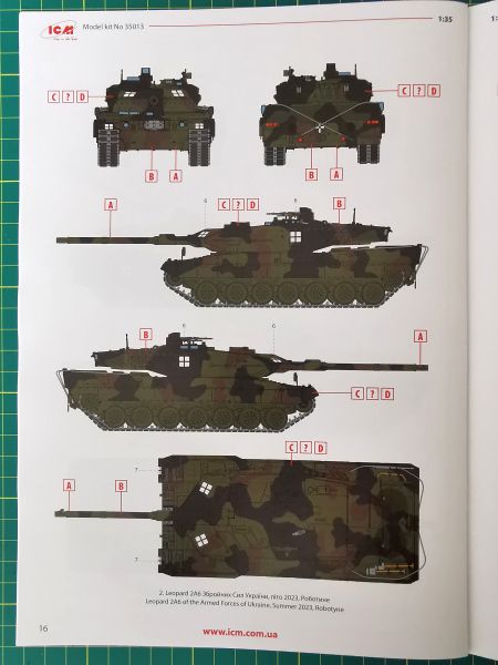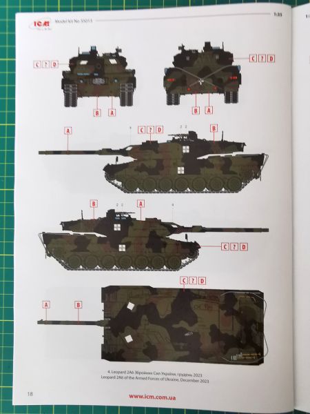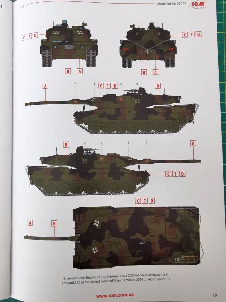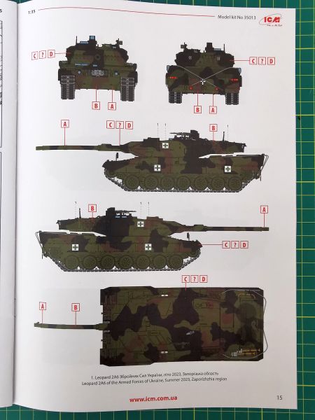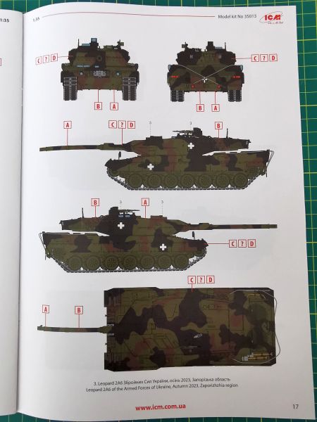 Opcji malowania jest aż sześć. Wszystkie oczywiście ukraińskie a bazujące na standardowym kamuflażu NATO. Na nim już na miejscu naniesiono wszelkiego rodzaju oznakowanie ograniczające się głównie do elementów szybkiej identyfikacji. Co ciekawe, instrukcja podaje szczątkowe informacje na temat miejsca działań bojowych niektórych wozów. Mamy zatem dwa pojazdy operujące w Regionie Zaporoskim, jeden z okolic miejscowości Robotyne. Trzy pozostałe ograniczają się jedynie do wskazania pory roku na przykład – grudzień 2023 r. czy zima 2024 r. Ze zrozumiałych względów nie ujawniono danych związków taktycznych, w skład których owe czołgi wchodzą. Schematy malowania oczywiście w postaci kolorowych plansz na końcu instrukcji.