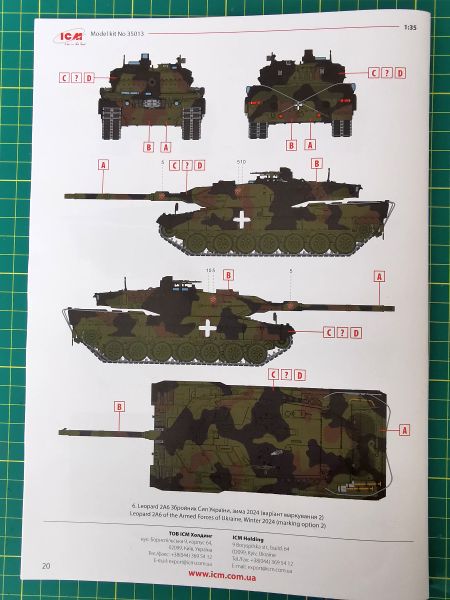 Podstawę zestawu stanowi model firmy Revell. Miał on swoją premierę w 2012 roku. Od tego czasu miał kilka wydań różnych wersji tego popularnego czołgu. Ponieważ we współczesnej pancerce nie siedzę, nie mam wiedzy, jaką pozycję zajmuje zestaw Revella wśród osób naprawdę znających się na rzeczy. Zestawu Revella także wcześniej nie maiłem w ręku, więc uznałem, że to dobra okazja, by przyjrzeć mu się bliżej. ICM, nie wypożyczał form, pozyskał natomiast pewną ilość kompletów wyprasek wyprodukowanych najprawdopodobniej w Polsce. Świadczy o tym kilka rzeczy. Po pierwsze sposób pakowania – dość charakterystyczna dla Revella gruba folia zaklejana zwykłą taśmą klejącą oraz logo Revella wytłoczone na wewnętrznej części podłogi wanny. Także tworzywo użyte do produkcji wyprasek jest inne, niż zazwyczaj używa tego ICM. Propozycja ICM-u umożliwia budowę wersji 2A6 używanej obecnie przez ukraińską armię. Wierzę na słowo, bo nie weryfikowałem tego z żadną dokumentacją.