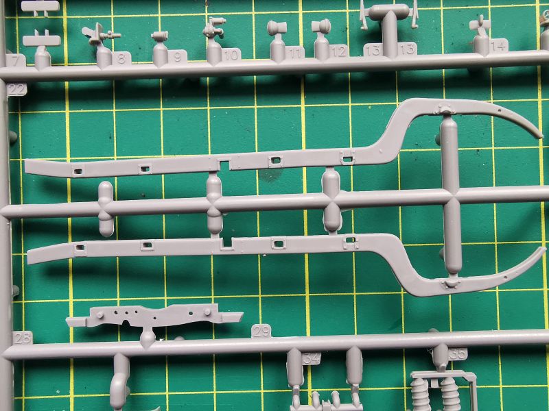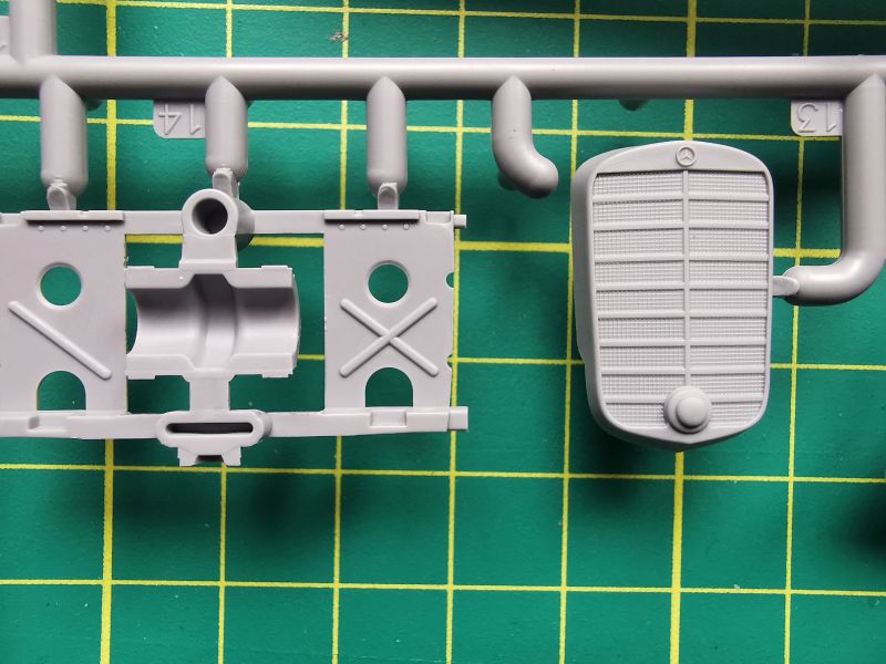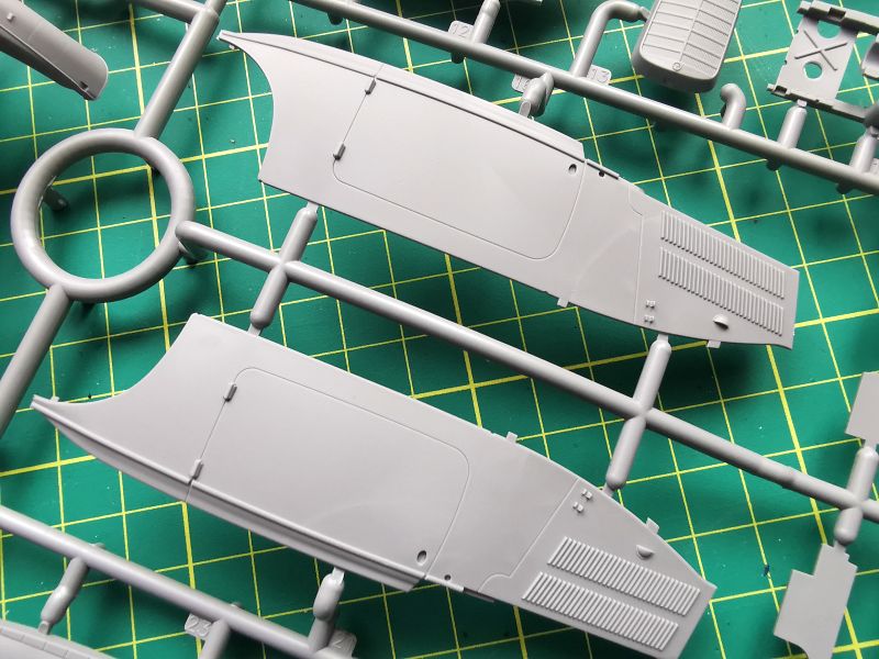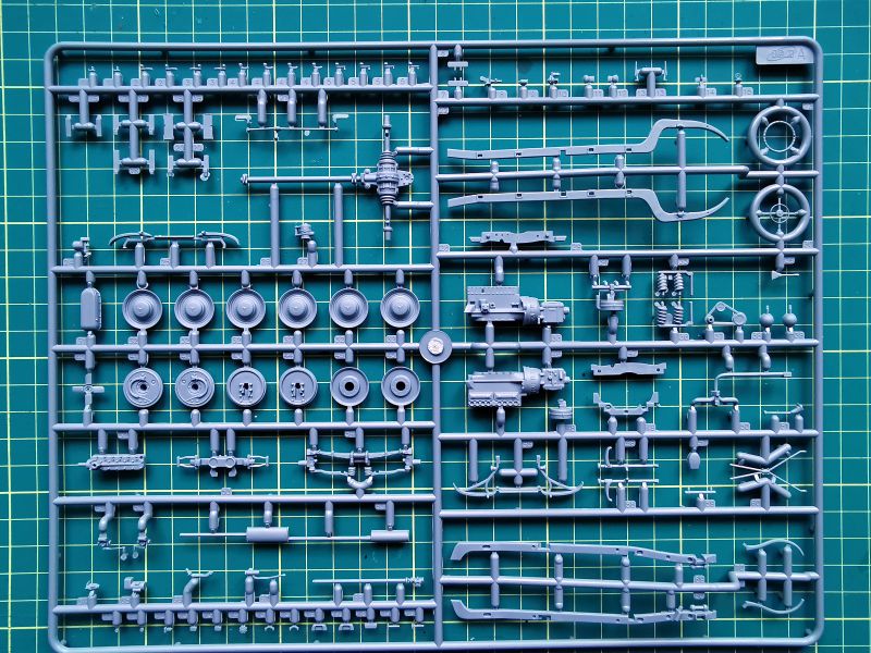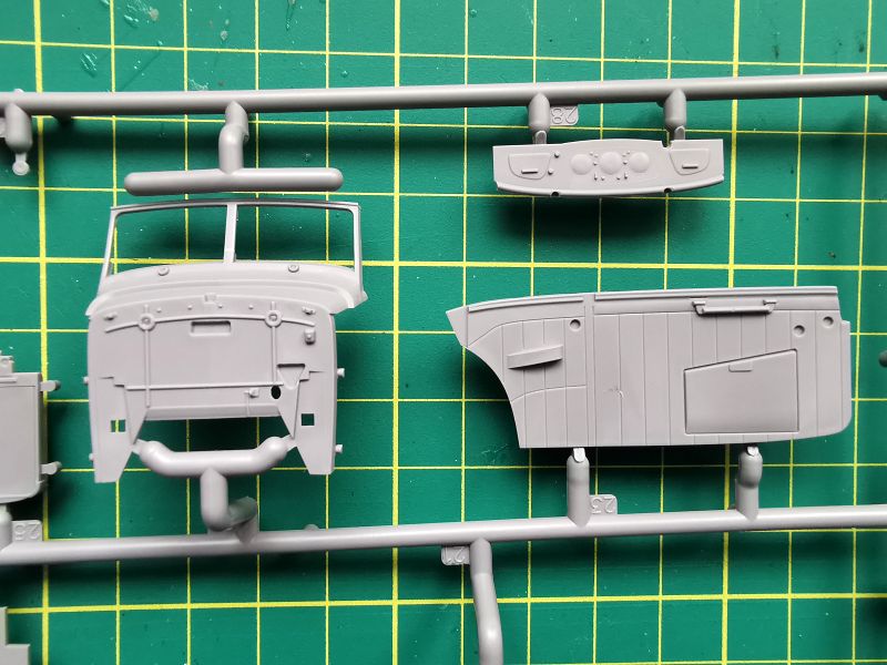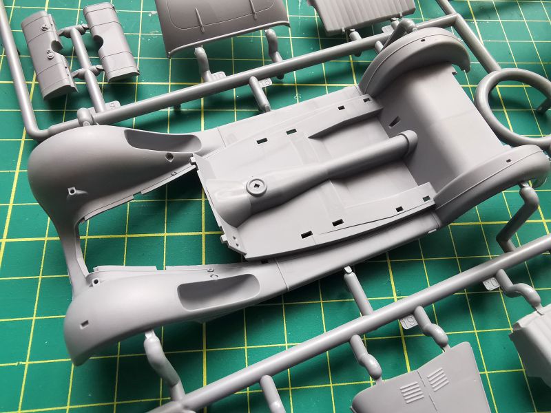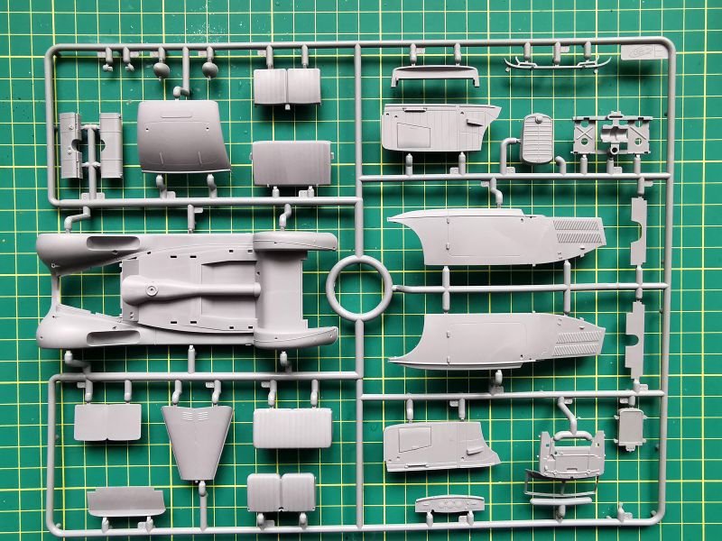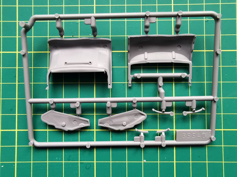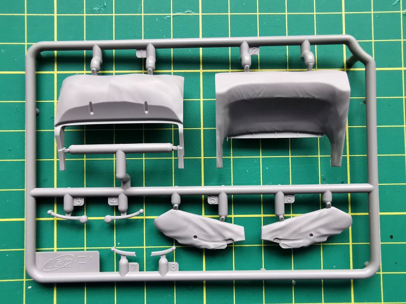 Zestaw składa się z trzech ramek z jasno szarego plastiku, odnośnie materiałów użytych do produkcji modelu oraz sposobu jego wydania nie zmieniło się tu kompletnie nic. Na ramce widocznej na zdjęciach znajdziemy głównie i wyposażenia kabiny. Ponieważ nie dysponuję jakąś bogatą dokumentacją ani oszałamiającą wiedzą na temat tego samochodu, postanowiłem skupić się na tym co mam przed sobą a nie dawać się w ocenę merytoryczną. Zestaw opracowano z dużą dbałością o szczegóły, nawet te najdrobniejsze. Detale wykonane wyraźnie i czysto. Producent nie przewidział możliwości wykonania drzwi, maski oraz pokrywy bagażnika w pozycji otwartej, co oczywiście nie znaczy, że się nie da. Musimy tylko popracować samodzielnie.