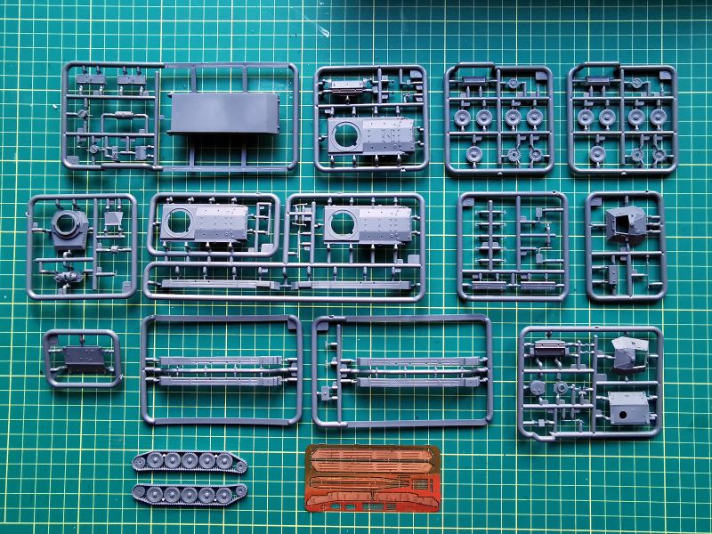 Wszak zmiany dotyczą jedynie końcówki lufy i tego należy spodziewać się po zawartości pudełka. Komplet wyprasek niemal identyczny, jak w przypadku modelu wersji Mk.I. Dołożono tylko wypraskę oznaczoną jako „J”. Jej zawartość to lufa z adapterem. Wykonana całkiem ładnie w technologii form suwakowych, choć pewnie znajdą się tacy, którzy podczas budowy zastosują jakiś zamiennik, toczony lub drukowany, jak tylko pojawi się na rynku.