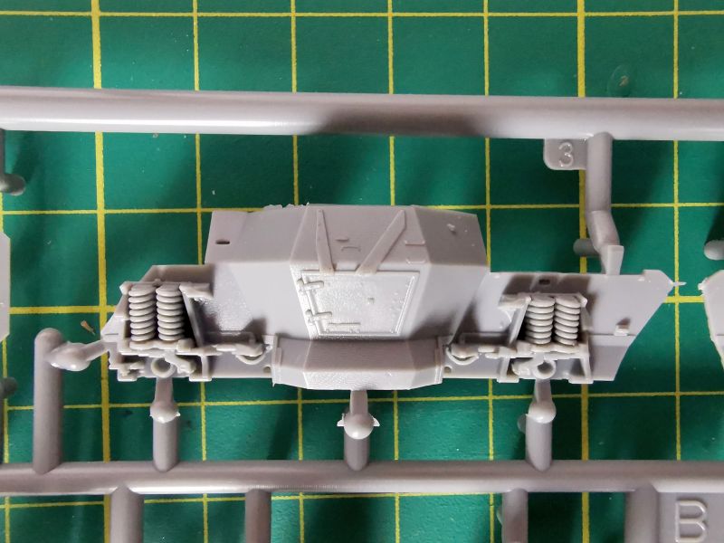 Zacznę nietypowo bo od ramki „B”. Zawiera ona podstawowe podzespoły wanny kadłuba oraz błotniki. Po bokach kadłuba jako integralne elementy wykonano amortyzatory. Zapewne niektórzy podniosą lament z tego powodu. To akurat mi nie przeszkadza, co więcej uważam, że wyszło to bardzo zgrabnie. Zaoszczędzi czas, nie będzie sprawiało problemu mniej zaawansowanym modelarzom a odpowiednio pomalowane na pewno będzie się efektownie prezentować.