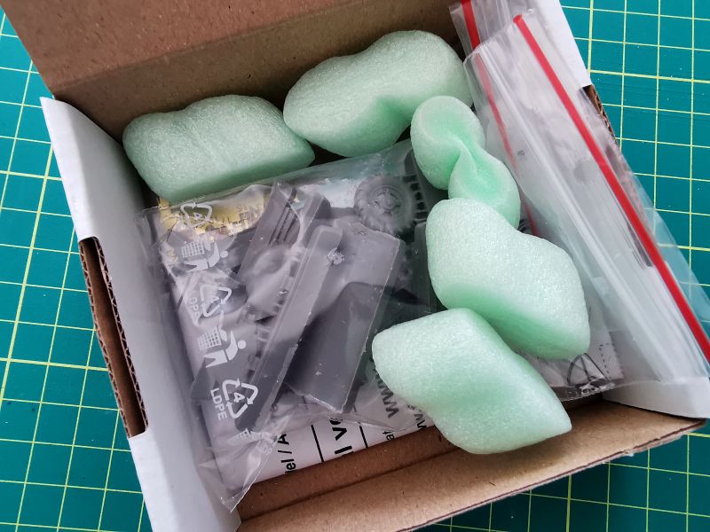 Najpierw ciągnik. Zapakowany został w niewielkie kartonowe pudełko, które zdobi kolorowa naklejka z podstawowymi informacjami o tym co jest w środku. W środku znajduje się natomiast torebka strunowa z żywicznymi odlewami stanowiącymi główny komponent zestawu oraz druga nieco większa z instrukcją, blaszką fototrawioną oraz arkusikiem kalkomanii. Wszystko to zabezpieczone styropianowymi chipsami.