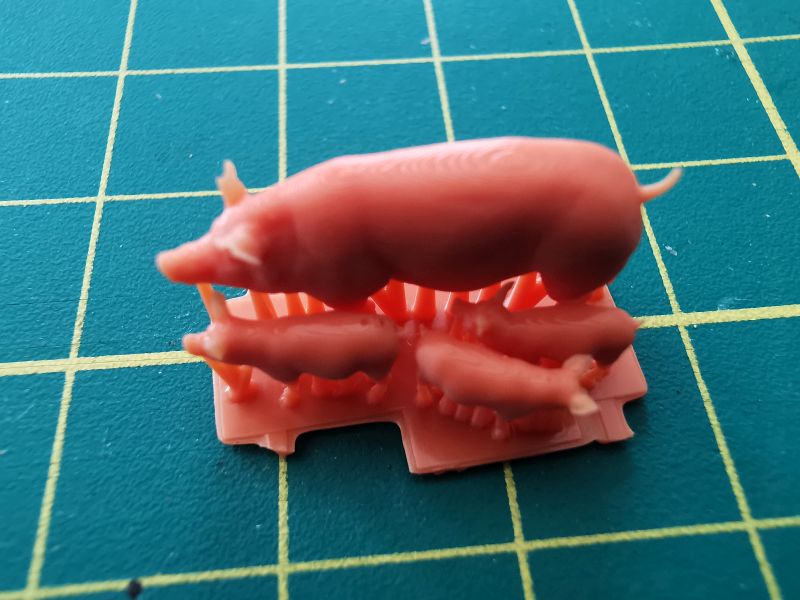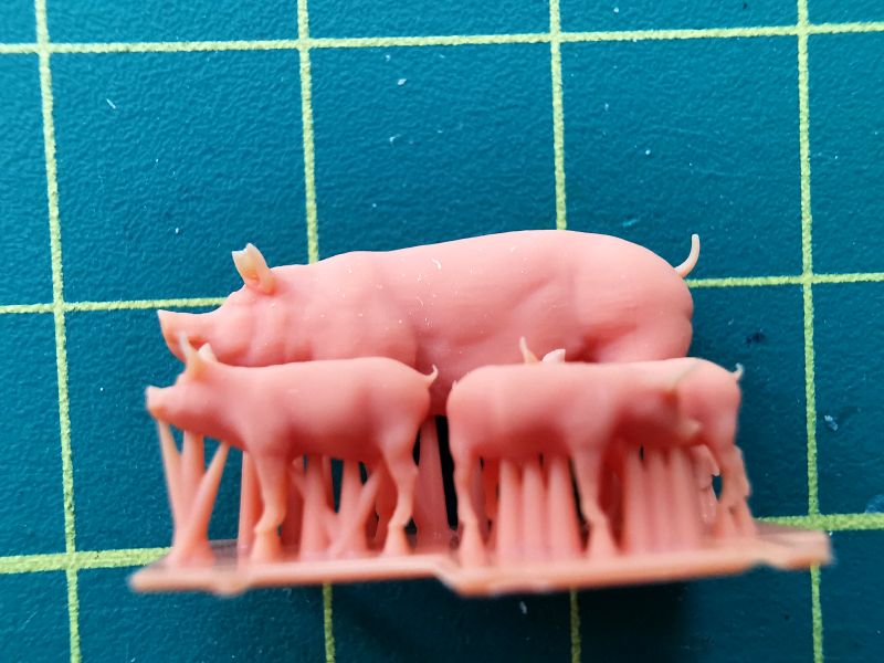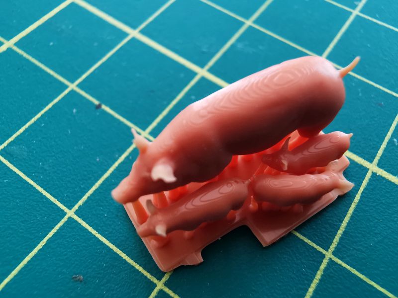 Świnki powstały bowiem w formie wydruku 3D, dzięki czemu oddano nawet najdrobniejsze szczegóły anatomiczne lochy i trzech prosiąt, które to wchodzą w skład zestawu. Wydrukowano je w pomarańczowo – różowej żywicy, co powinno ułatwić malowanie.