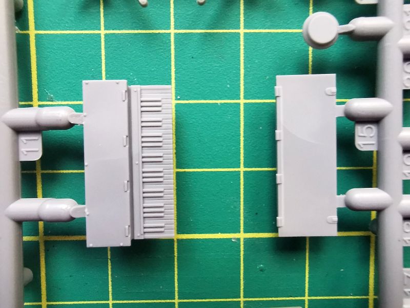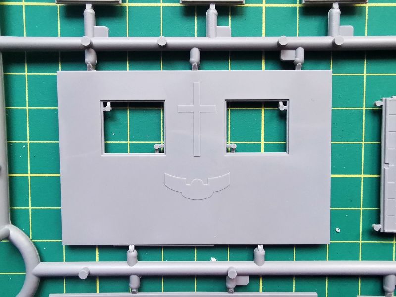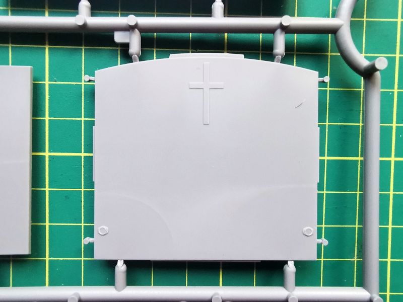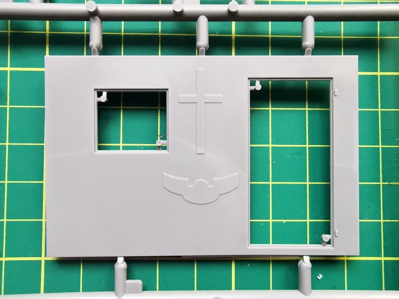 Ramka „G” to z kolei wyposażenie kaplicy, polowy ołtarz, przybory liturgiczne, organy, słowem wszystko co jest niezbędne do odprawienia nabożeństwa w obrządku anglikańskim. Podstawowe elementy modelu wykonano z jasnoszarego plastiku, przy czym ten zestaw w niczym nie odbiega od innych produktów ICM-u. Dobrze i szczegółowo wykonany, na wypraskach nie zauważyłem, żadnych nadlewek, jamek skurczonych, czy też innych niedoskonałości produkcji. Nie zauważyłem także śladów po wypychaczach.