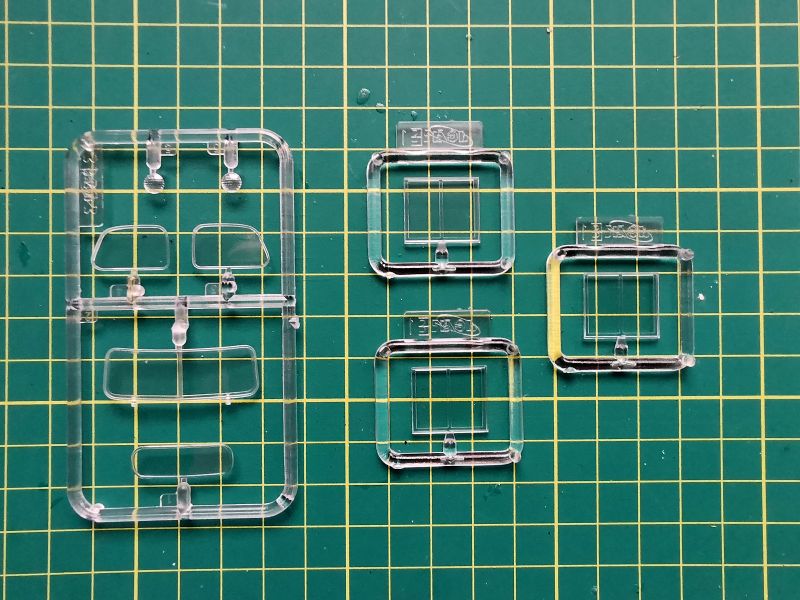 Uzupełnieniem omówionych powyżej elementów z tworzywa, są oczywiście detale przezroczyste. Są to w sumie cztery ramki, pierwsza większa zawiera szyby szoferki oraz klosze reflektorów, zaś trzy pozostałe, mniejsze to okna kaplicy. Oszklenie robi bardzo pozytywne wrażenie pod względem przejrzystości poszczególnych elementów. Nie mam im nic do zarzucenia.
