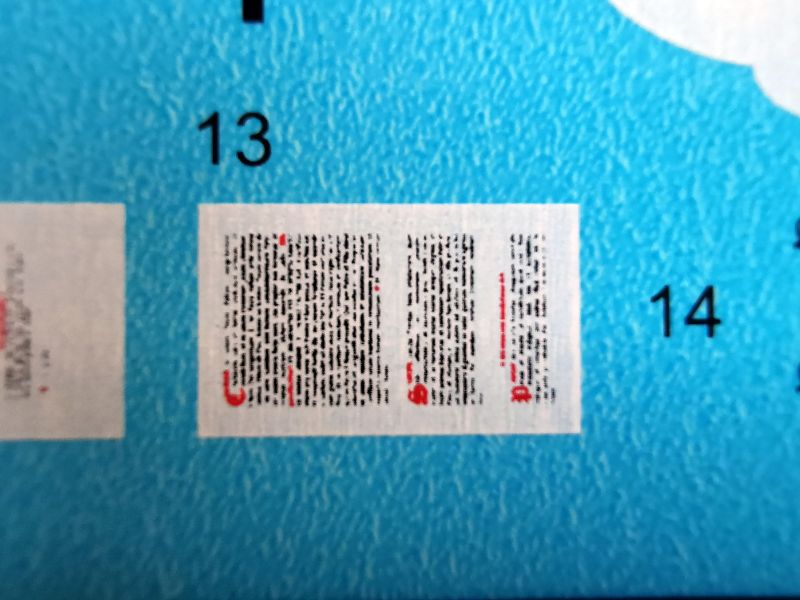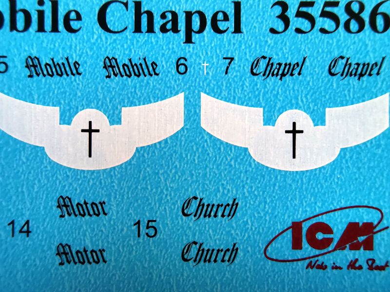 Kalkomania to stosunkowo niewielki arkusik na którym znalazły się tarcze zegarów do naklejenia w szoferce, lampy odblaskowe, białe i czerwone a także całe wyposażenie kaplicy. Ono zajmuje lwią cześć powierzchni arkusika. Nie tylko oznaczenia zewnętrzne, ale także klawiatura organów oraz strony mszału i śpiewnika. O jakości kalkomanii ICM-u pisałem już kilkakrotnie przy okazji relacji z budowy ich modeli, myślę że w przypadku tych kalkomanii nic nie uległo zmianie.