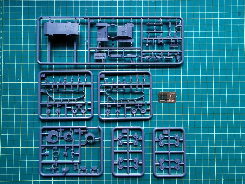 W stosunku do poprzedniego zestawu, czyli 72071 jedyna różnicą jest tutaj obecność niewielkiej ramki wtryskowej oznaczonej jako „E”. Znaleźć ją możemy w zestawach z Moultierami, a znajdują się na niej rama, trochę elementów układu wydechowego oraz błotniki. Tylko te ostatnie wykorzystamy w budowanym przez nas modelu. Pozostałe wypraski oraz fototrawiona blaszka są identyczne jak w zestawie 72071.