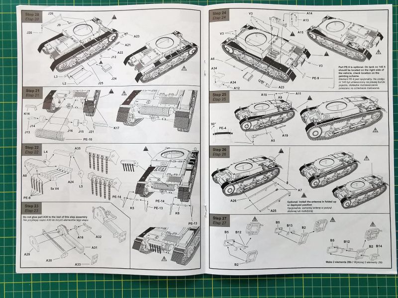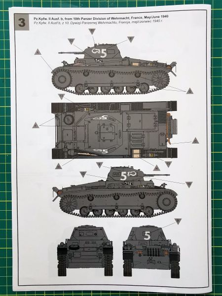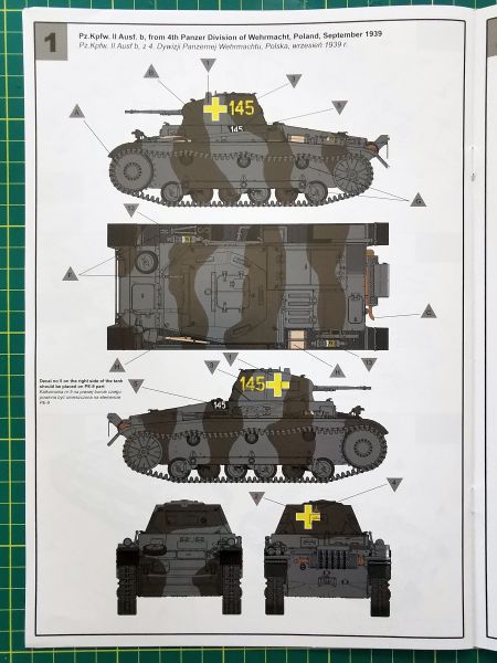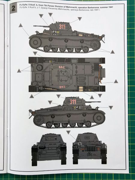 Jak zaznaczyłem powyżej, mamy trzy warianty malowania. Jeden oczywiście z Kampanii Wrześniowej w charakterystycznym kamuflażu. Dwa kolejne – ciemno szare to okres nieco późniejszy, czyli Kampania Francuska oraz Operacja Barbarossa, przy czym są one dość znane w literaturze, nawet takiemu laikowi jak ja. Schematy w postaci barwnych plansz z krótkimi opisami znalazły się na ostatnich stronach instrukcji…