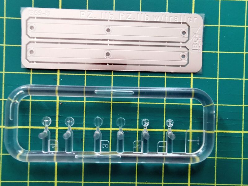 Ramka „T” czyli przezroczysta oraz blaszka z charakterystycznymi belkami spinającymi wózki kół jezdnych. Drugą, nieco większą blaszkę opracowano na potrzeby tego zestawu. Znajdziemy na niej trochę przydatnych rzeczy, których zamontowanie na pewno dobrze wpłynie na ostateczny wygląd naszej miniatury.