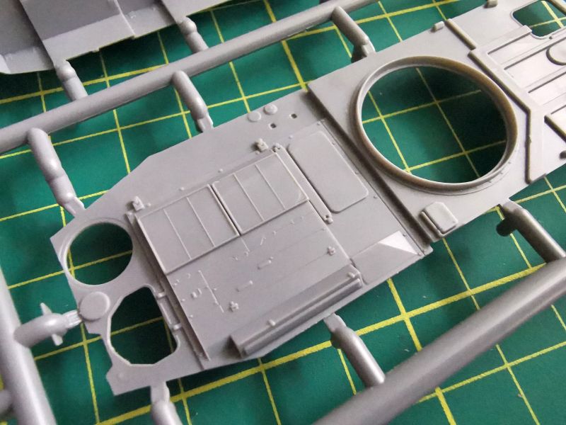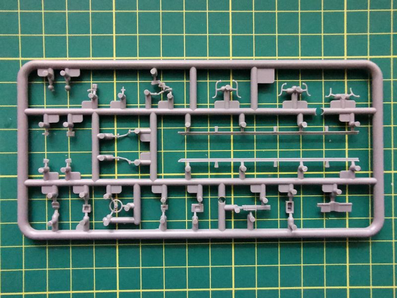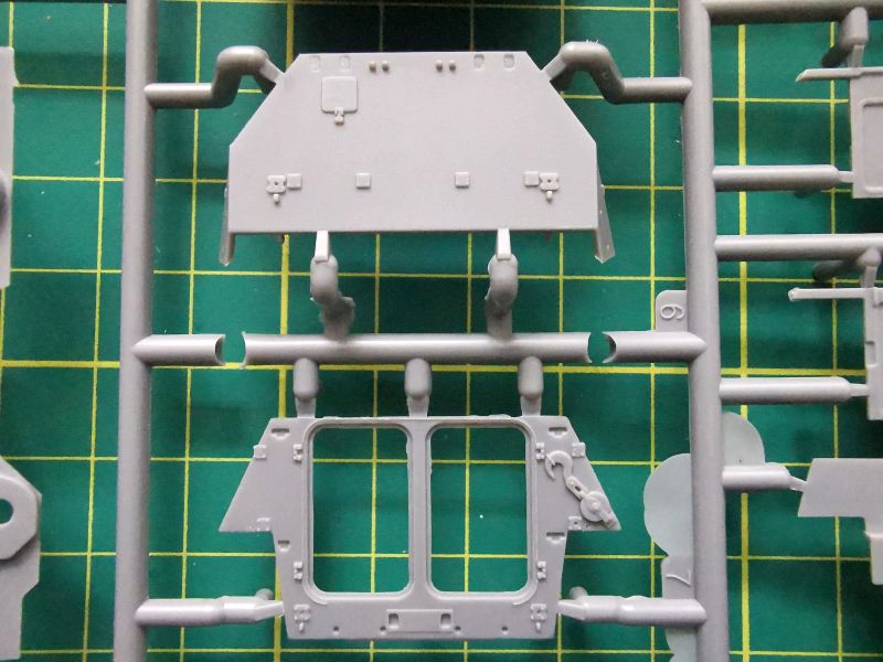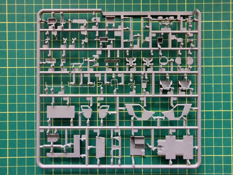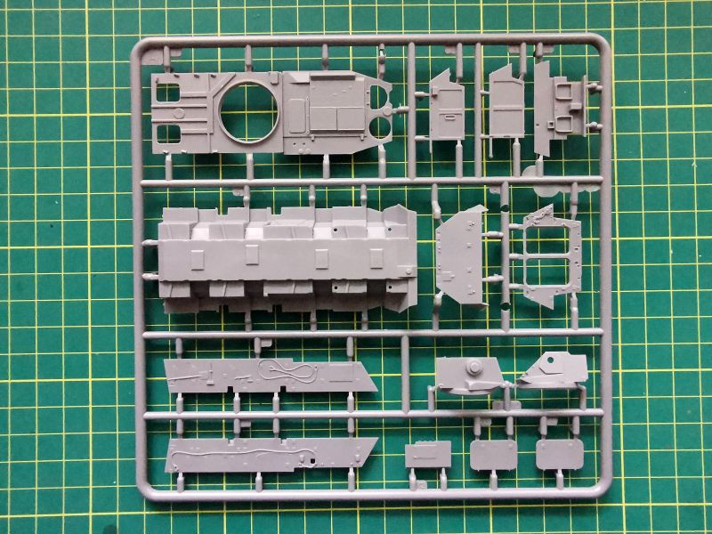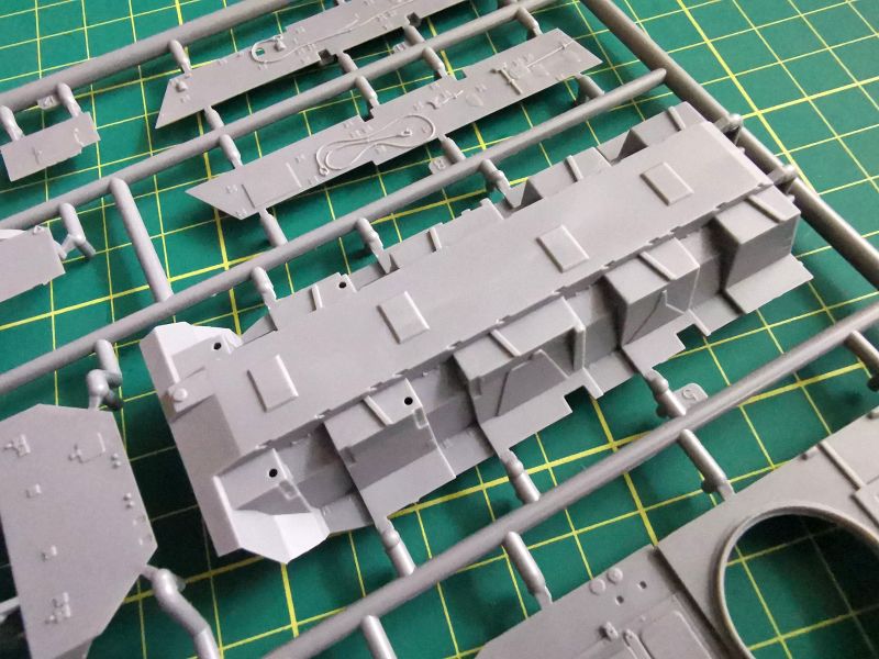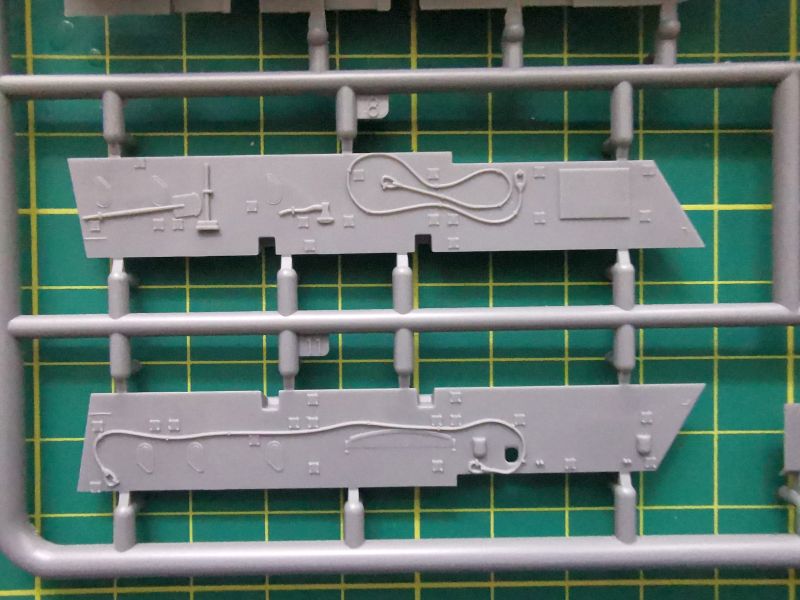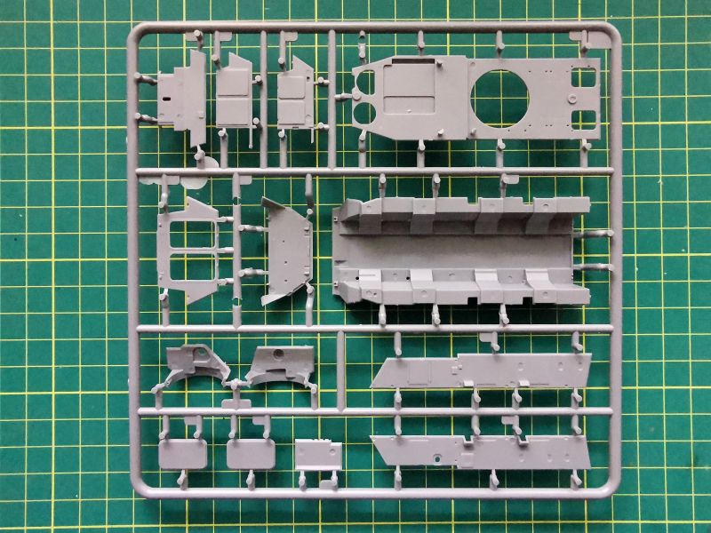 Przegląd ramek wchodzących w skład zestawu , zacznę od dwóch o największych gabarytach. Na ramce „A” rozmieszczono podstawowe podzespoły kadłuba oraz wieżyczki. Detale ładnie wykonane, wyraźnie i dokładnie. Mogą natomiast pojawić się głosy, że osprzęt saperski nie powinien być odlany razem z burtami kadłuba, tylko wykonany jako osobne elementy, bo trudno to potem pomalować. Czy to wada, dla niektórych pewnie tak, dla innych nie, wszystko zależy od umiejętności modelarza.