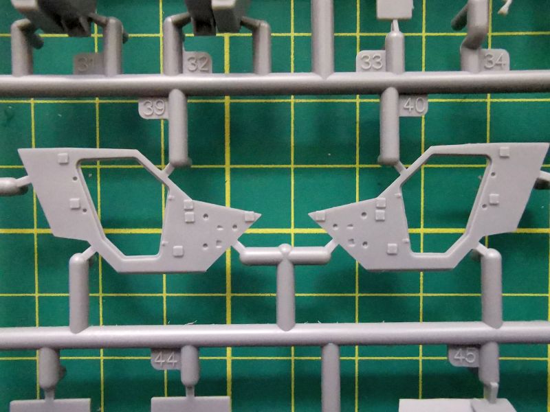 Omówione powyżej ramki są wspólne, dla obu zestawów, więc teraz czas na różnice. Po pierwsze zestaw z pancerzem kratownicowym zawiera ramki oznaczone jako „H” oraz „J”. Według diagramu z instrukcji ramek „H” powinno być dwie, zaś ramka „J” pojedyncza. W egzemplarzu testowym obie ramki były podwójne. Nie wiem czy zaszła pomyłka, czy tak ma być. Mi to oczywiście nie przeszkadza, bo na oby ramkach znajdują się delikatne pręty do zamontowania osłon kratownicowych.