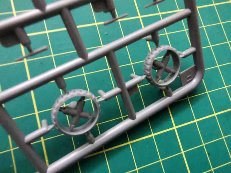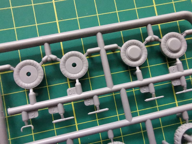 Na ramce „F” projektant modelu umieścił podzespoły kół jezdnych, foteli oraz kilka drobnych detali, które występują w większej ilości. Dlatego dostajemy cztery takie ramki. Konstrukcja kół przypomina nieco patent zastosowany w Rosomaku w skali 1/35. W centralną część z bieżnikiem sklejamy boczne ściany opon wraz z felgami. Jednym to pasuje, innym nie, kwestia gustu a nie umiejętności.