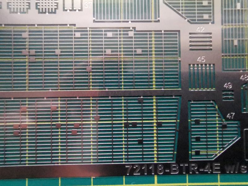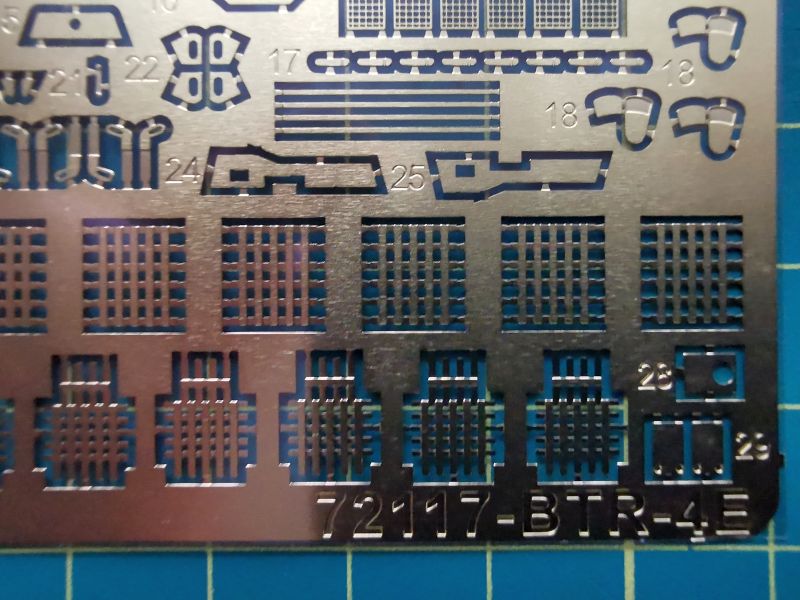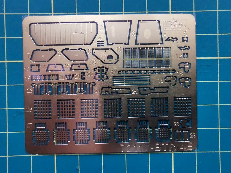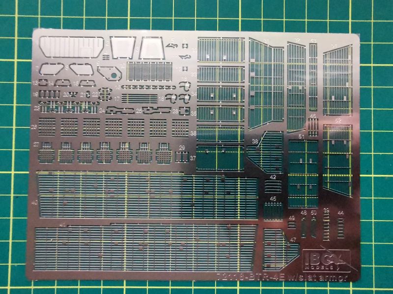 Detale fototrawione to w zestawach IBG Models standard. Tak jest w przypadku obu modeli ukraińskich BTR-ów. W pierwszym przypadku nie mamy do czynienia z blaszką ale całkiem konkretną blachą. Jej wymiarów nie powstydziłby się model samolotu w skali 1/48 lub pancernik w skali 1/700 i to taki z dużą ilością masztów kratownicowych. Wszystkie osłony kratownicowe wykonano właśnie jako detale fototrawione, co w mojej ocenie jest bardzo dobrym pomysłem. Dysponujemy oczywiście całym kompletem takich osłon, ale nie musimy wykorzystywać wszystkich. W sieci znajduje się bowiem spora ilość zdjęć wykonanych także w warunkach bojowych a widoczne na nich transportery zazwyczaj mają osłony jedynie na wieży. Wykonanie kratownic w formie fototrawek daje nam także możliwość powyginania ich lub nawet porozrywania (takie zdjęcia także są) co nada naszej miniaturze jeszcze większego realizmu. Na blaszce znalazły się siatki na fotele w przedziale desantowym, różnego rodzaju pokrywy i cała gama drobnych detali takich jak uchwyty, klamki i temu podobne.