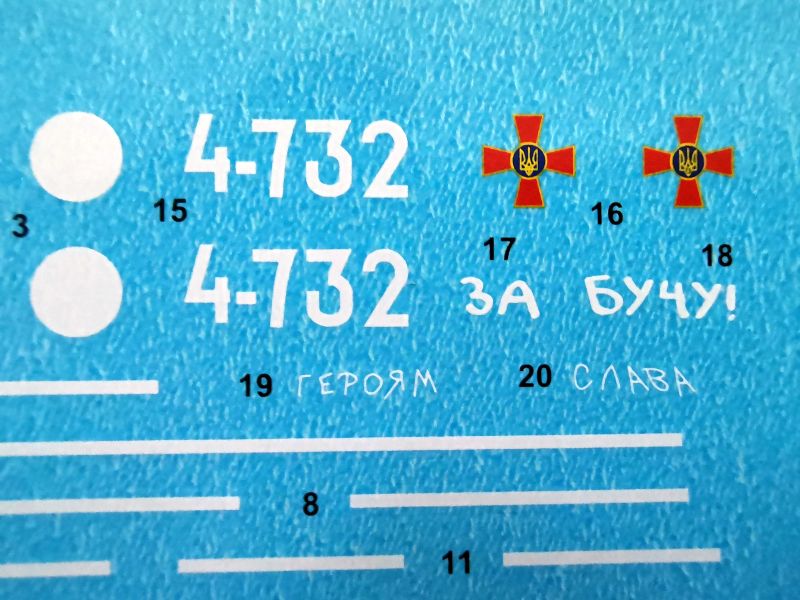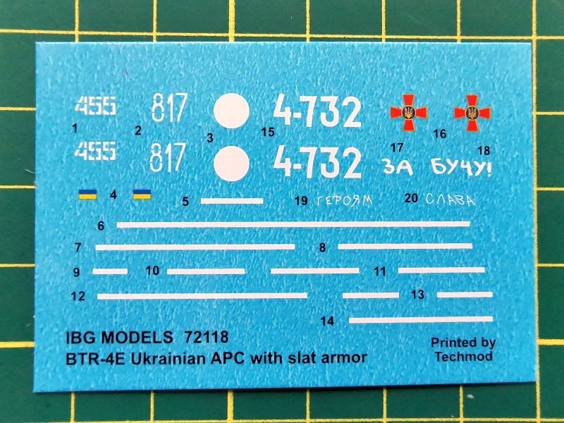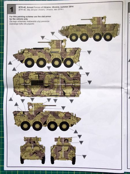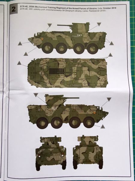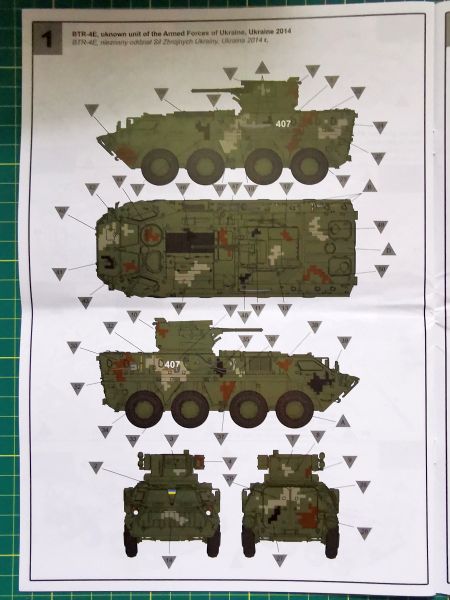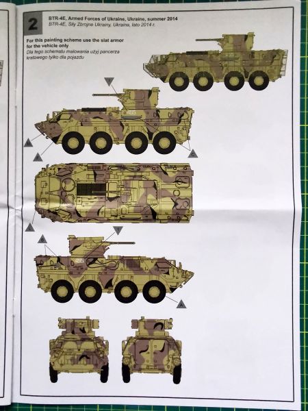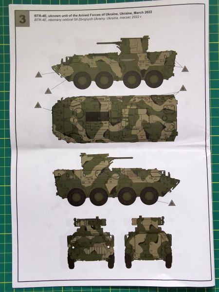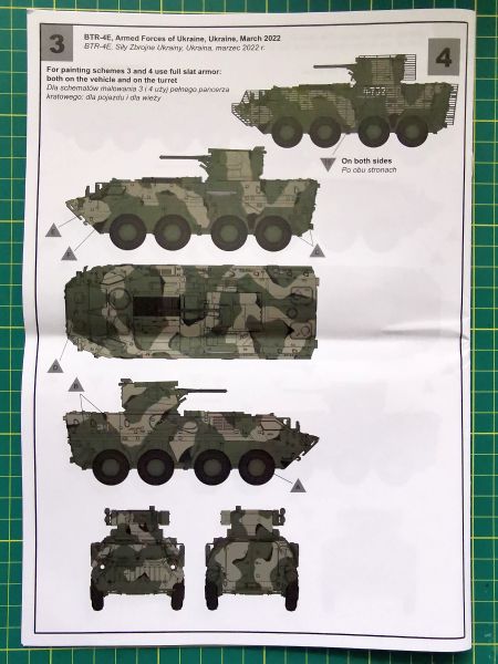 Inaczej natomiast ma się sprawa z zaproponowanymi schematami malowania. Do dyspozycji mamy trzy. Dwa z lata 2014 r., czyli okresu działalności „Zielonych Ludzików” na Krymie oraz jeden z marca 2022 r. a więc pojazd z okresu obecnie trwającej wojny. Co ciekawe, producent nie wskazuje konkretnych związków taktycznych do których przydzielone były dane pojazdy, ale udziela konkretnych wskazówek odnośnie montażu osłon kratownicowych, co oznacza, że przy opracowywaniu posługiwano się jakąś konkretną dokumentacją. W przypadku malowania z 2022 r. naklejamy tylko numer na boki pojazdu, pomijamy inne oznaczenia i inskrypcje wymalowane na płytach pancernych chroniących przednie szyby w przedziale kierowcy. Pojazd ma trójkolorowy kamuflaż i komplet kratownic. Natomiast pojazd widoczny na boxarcie ma kamuflaż pixelowy, inny numer taktyczny, inskrypcje na pancerzu a osłony tylko na wieży. Rozwiązania tej zagadki należy poszukać moim zdaniem w Internecie.