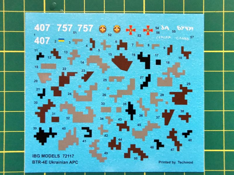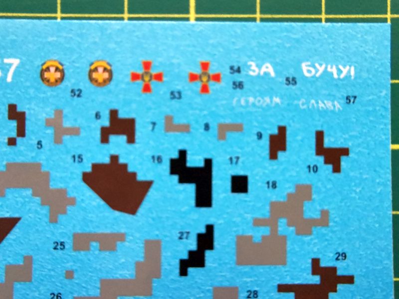 Arkusik kalkomanii jest natomiast znacznie większy, bo zawiera elementy Digital Camo tak powszechnie stosowanego przez ukraińską armię. Wystarczy pomalować model kolorem bazowym i okleić odpowiednimi kalkomaniami by cieszyć się miniaturą w efektownym malowaniu.