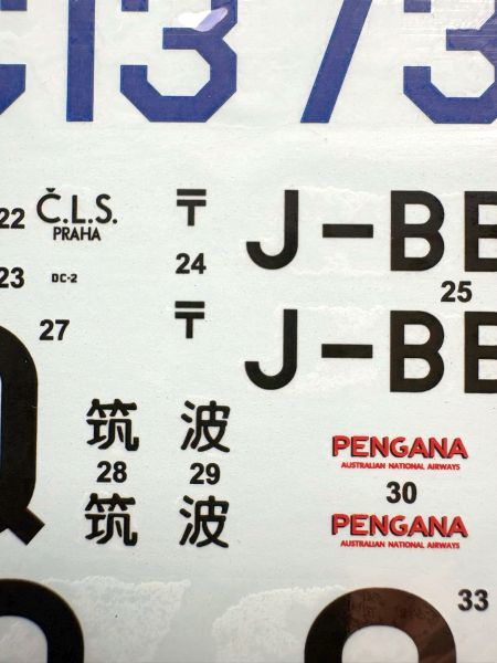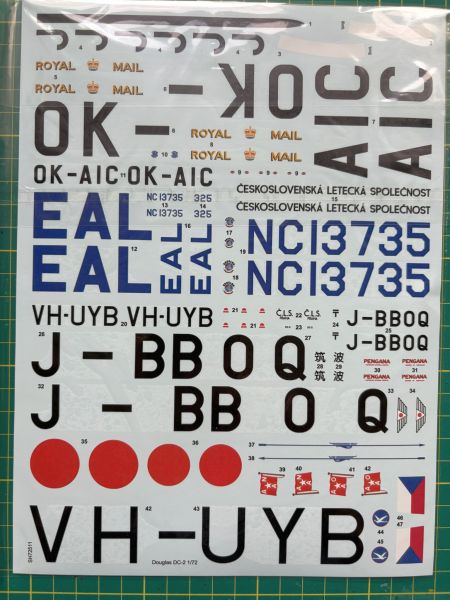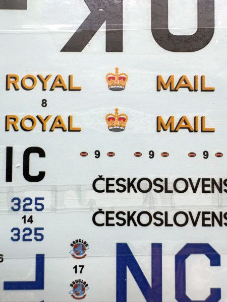 Arkusz kalkomanii dołączony do zestawu jest wręcz imponujący i z trudem mieści się w pudełku. Nie ma się podziwić. Pięć wariantów malowania, do tego wszystkie to malowania z linii lotniczych. Nawet przy baraku bardziej skomplikowanych elementów graficznych w rodzaju logotypów czy godeł i tak wystarczyło, by powierzchnię arkusza wypełnić numerami rejestracyjnymi. Kto drukował kalkomanie widać od razu. Posiadają usuwalną błonę, o czym trzeba pamiętać po całkowitym wyschnięciu kalkomanii.
