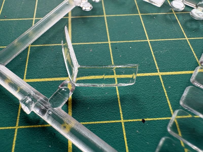 Ramka z oszkleniem jest niewielka w stosunku do opisanych powyżej. Znajdziemy na niej wiatrochron, okna kabiny pasażerskiej oraz klosze reflektorów. Jakość wykonania jest bez zarzutu. W przypadku budowy modelu w konwencji „prosto z pudła” możemy wkleić, jak jest, jeśli natomiast będziemy odtwarzać wnętrze, chyba dobrze zrobi drobna polerka.