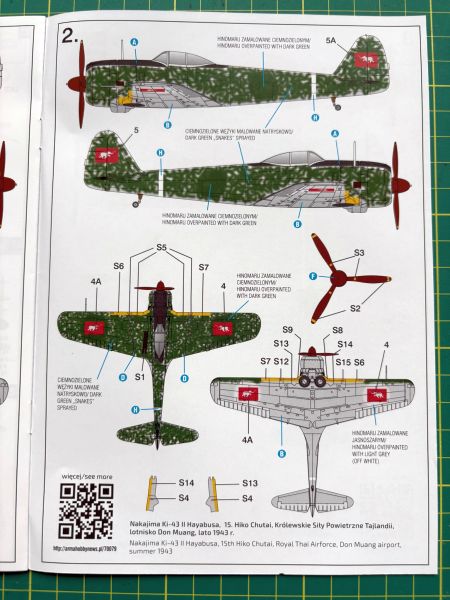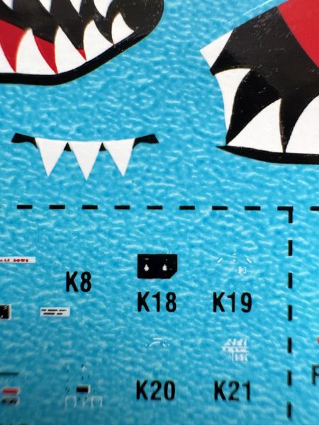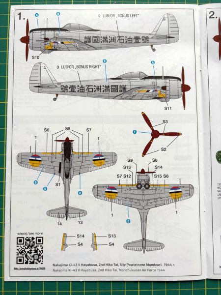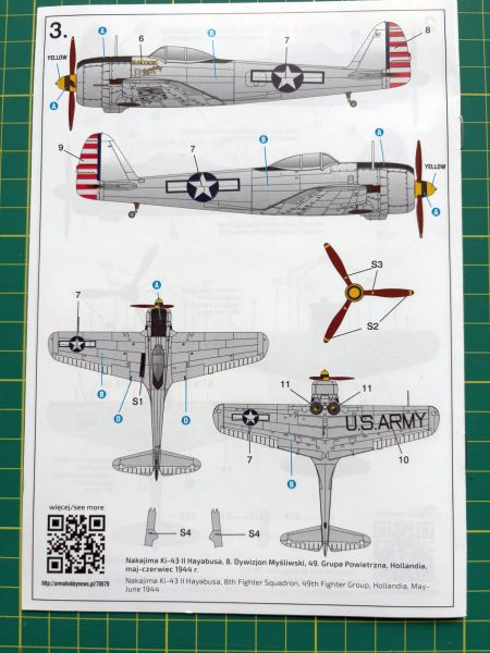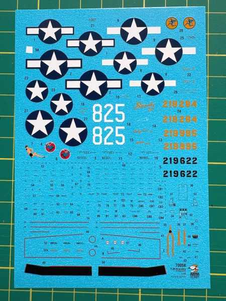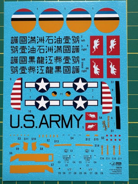 Inne malowania, to siłą rzeczy inne kalkomanie. Uwagę przyciągają charakterystyczne dla lotnictwa wojskowego Mandżurii i Tajlandii oznaczenia i napisy. Arkusz jest dość spory, bo i oznaczeń nie mało, są także stencile i kalkomanie do umieszczenia w kokpicie, dwa komplety.