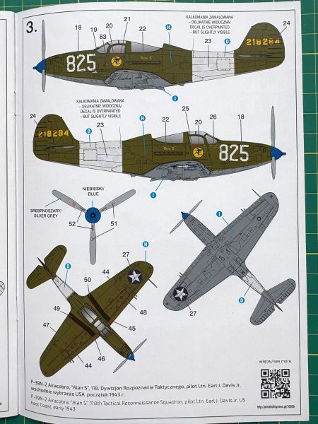 Proponowane warianty malowania są niemal identyczne jak w przypadku zestawu w skali 1/48, jedyna różnica dotyczy samolotów 82 Dywizjonu Rozpoznawczego z Nowej Gwinei: