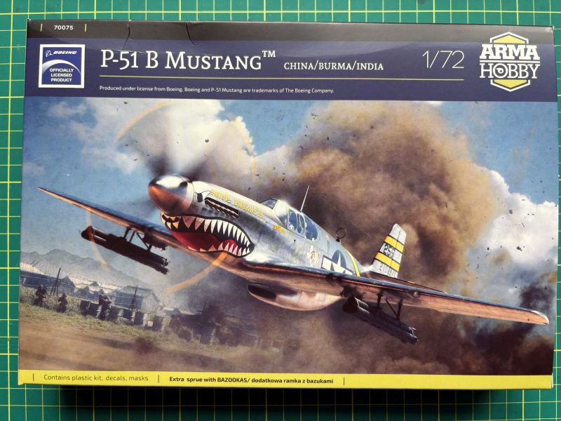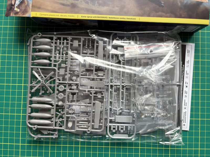 Skoro była mowa o Mustangach, to można przyjrzeć się trzeciemu z pudełek, a jest w nim właśnie Mustang i to uzbrojony w rurowe wyrzutnie niekierowanych pocisków rakietowych. Muszę tu przyznać, że przy boxarcie Piotr przeszedł samego siebie. W pierwszej chwili myślałem, że jakieś paprochy spadły mi na pudełko, a okazało się, ze że to odłamki powstałe w wyniku ataku z małej wysokości.