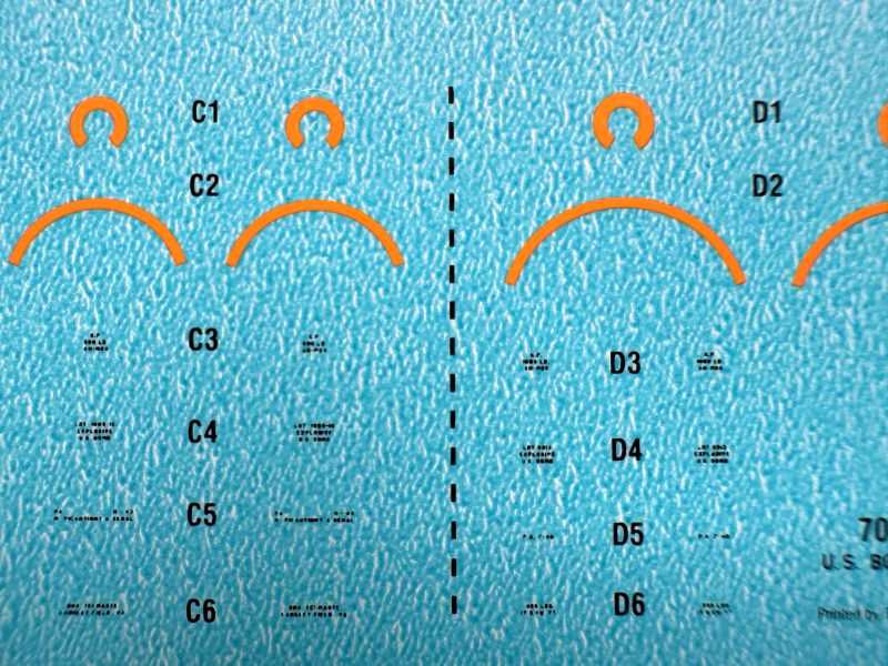 Kalkomania prezentuje się następująco. Tu proporcje znaków w stosunku do stencili zostały przechylone na korzyść tych pierwszych. Jest to zupełnie zrozumiałe, ponieważ na samolotach, których oznaczenia producent nam proponuje jest sporo kolorowych emblematów.