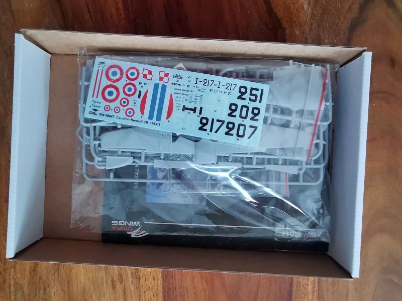 Zacznę oczywiście od modelu. Od modelu ukraińskiej firmy Dora Wings, która trzeba przyznać doskonale wyczuwa zapotrzebowanie rynku dobierając tematykę do swoich zestawów. Modeli francuskiego myśliwca w podziałce 1/48 do niedawna nie było w cale, jeśli nie liczyć niskonakładowych zestawów żywicznych, takich jak na przykład JGMT. Potem pojawił się zestaw firmy RS Models, który jednak sercami modelarzy nie zawładnął. Powodami zapewne były dość wysoka cena w chwili premiery i znaczne uproszczenia zestawu. Jak zatem na tym tle wygląda model Dora Wings? Po pierwsze pudełko, estetyczna szata graficzna i efektowny boxart, na którym trzeba przyznać, że CR.714 wygląda naprawdę bojowo, zachęcają do zapoznania się z zawartością. W środku mamy foliową torebkę zawierającą wypraski, blaszkę fototrawioną, maski oraz kalkomanię. Jest także instrukcja montażu i malowania.