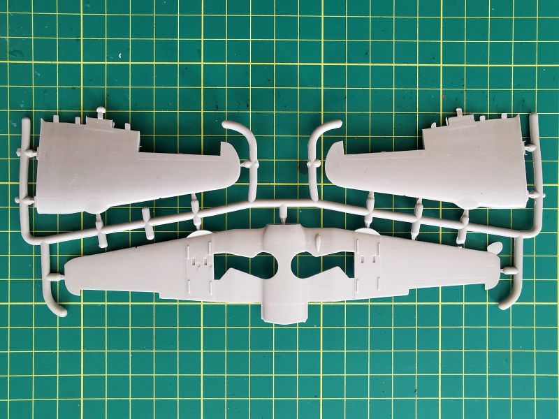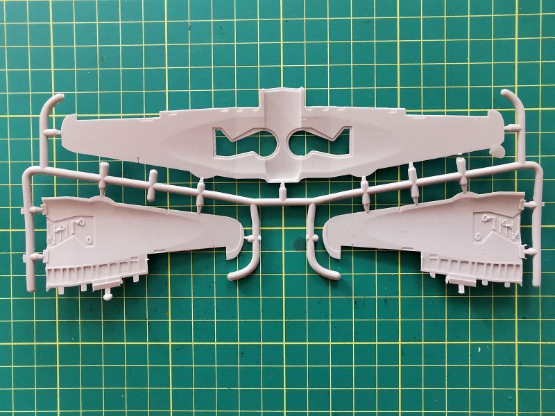 Ramek wtryskowych jest sześć, przy czym na ramkach nie ma tabliczek z numerami poszczególnych elementów, te znajdziemy w rozpisce na początku instrukcji. Na ramkach znajduje się w sumie 138 elementów, a więc dość sporo, jak na model tego typu. Do tego należy doliczyć cztery przezroczyste, ale o nich będzie mowa później. Na ramce „A” znajdują się połówki kadłuba, dolne części osłony silnika oraz osłony karabinów maszynowych. Wiadomo zatem, że model ma klasyczny podział technologiczny i żadnych sensacji w tym zakresie nie będzie. Miejsca łączenia połówek kadłuba mają kołki ustalające, jeszcze do niedawna rzecz nie spotykana w modelach tej technologii. Linie podziału wykonano jako wgłębne, są one delikatne, ale wyraźne i równe. Odtworzono także i nity w miejscach, gdzie występowały one w prawdziwym samolocie. Sporo także się dzieje wewnątrz, gdzie burty kabiny pilota mają bardzo bogato odtworzoną fakturę. Doklejane osobno osłony silnika w dolnej części dają natomiast pokusę, aby przemyśleć temat pokazania fragmentu silnika, ponieważ makieta jednostki napędowej jest w zestawie, podobnie jak karabiny maszynowe, ale o tym za chwilę.