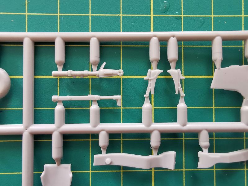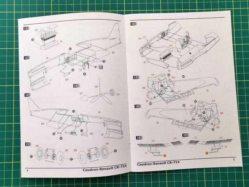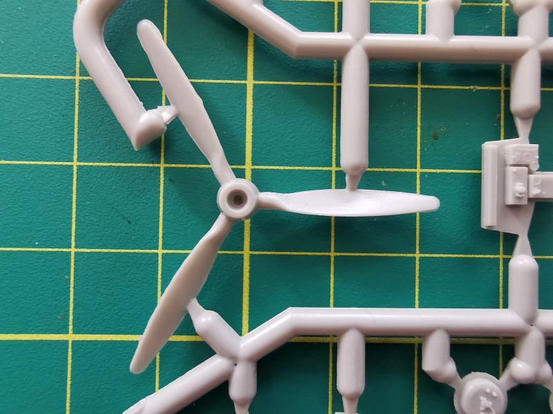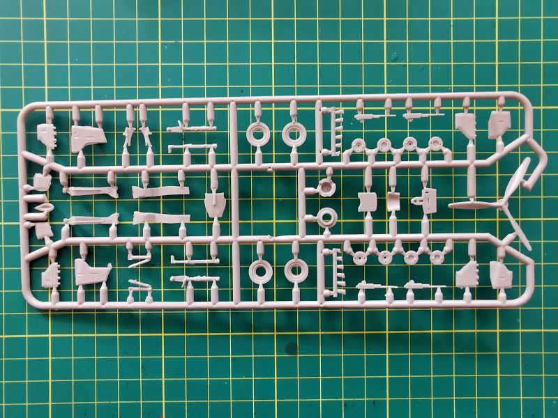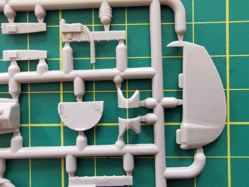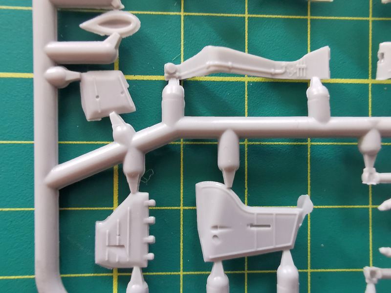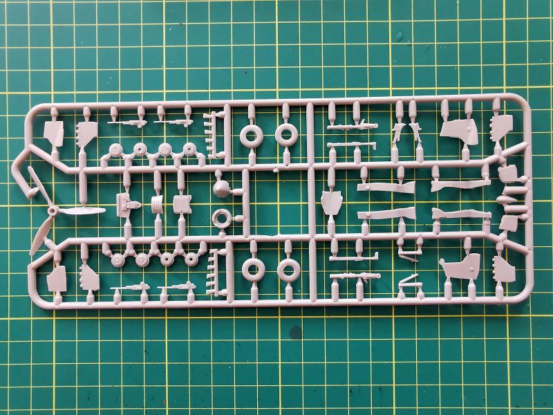 Znajdują się one także na bocznych ściankach komór podwozia, które projektant modelu zamieścił wraz spora ilością drobnych detali na wyprasce „E” Podwozie to większa cześć zawartości tej wypraski i trzeba przyznać, że poświęcił mu dość sporo uwagi. To kilkanaście dość szczegółowo opracowanych elementów, z czytelnym i wyraźnym detalem, co sprawi, że model nie będzie po sklejeniu wyglądać ubogo. Koła podwozia głównego mają piasty wykonane jako, oddzielane elementy i to w dwóch rodzajach. Pamiętać należy, że zestaw umożliwia wykonanie wczesne wersji CR.714 a nadwyżka, jest przewidziana do kolejnych zestawów, których wydanie producent planuje. Wszystkie piasty mają osobne numery i rozróżnienie na prawe i lewe więc trzeba uważać podczas montażu i trzymać się instrukcji. Na tej wyprasce znajduje się także śmigło z kołpakiem, karabiny maszynowe, rury wydechowe. Jakby ktoś zrobił je drukowane lub żywiczne, byłoby dobrze. Nawiercenie rur o takim kształcie i wymiarach jest bardzo trudne do wykonania. Producent umieścił tu także trochę podzespołów kokpitu w tym fotel pilota składający się z aż czterech detali, co raczej wynikało z uwarunkowań technologicznych, niż z chęci wywołania efektu WOW!